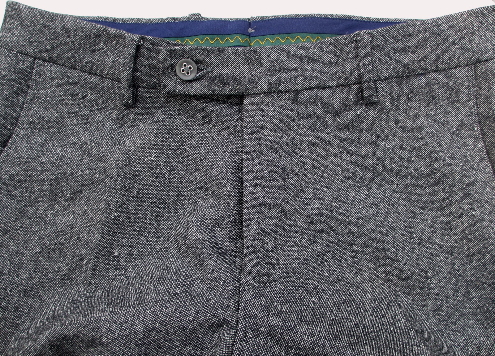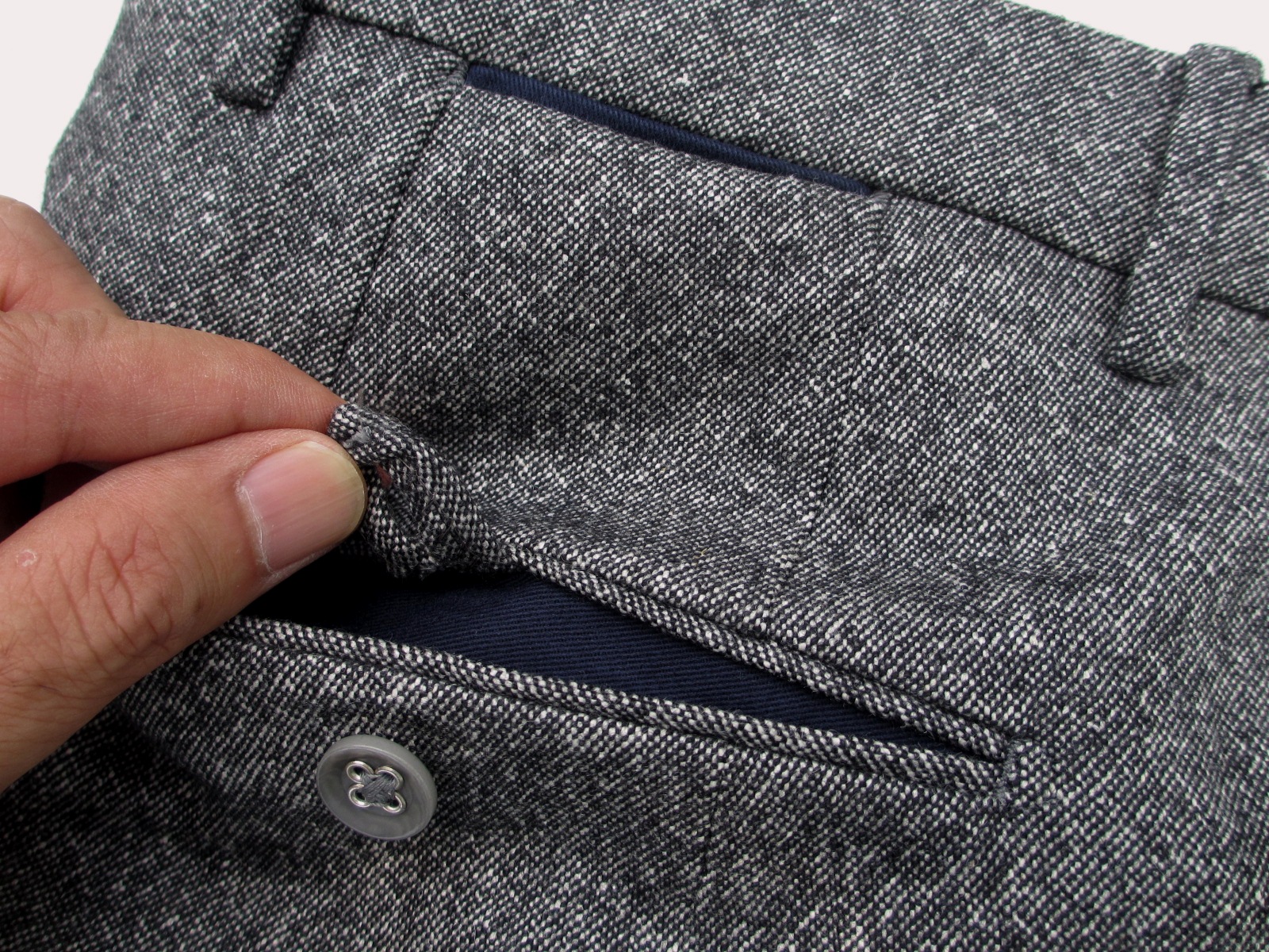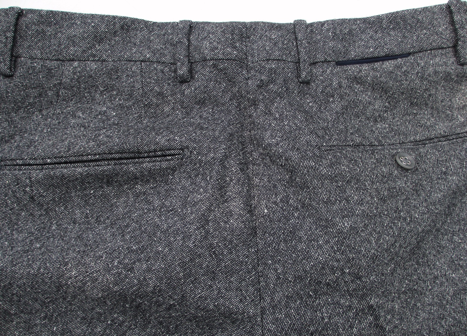 右後ろポケットについた共地のループ留めと、上のウエスト部分についたミニポケット。内側には色つきのスレーキ(綾織りの布)が付き、このブランドのアクセントとなっています。尚、写真はないのですが、右サイドの斜めポケット内側にサブポケットが付いています。