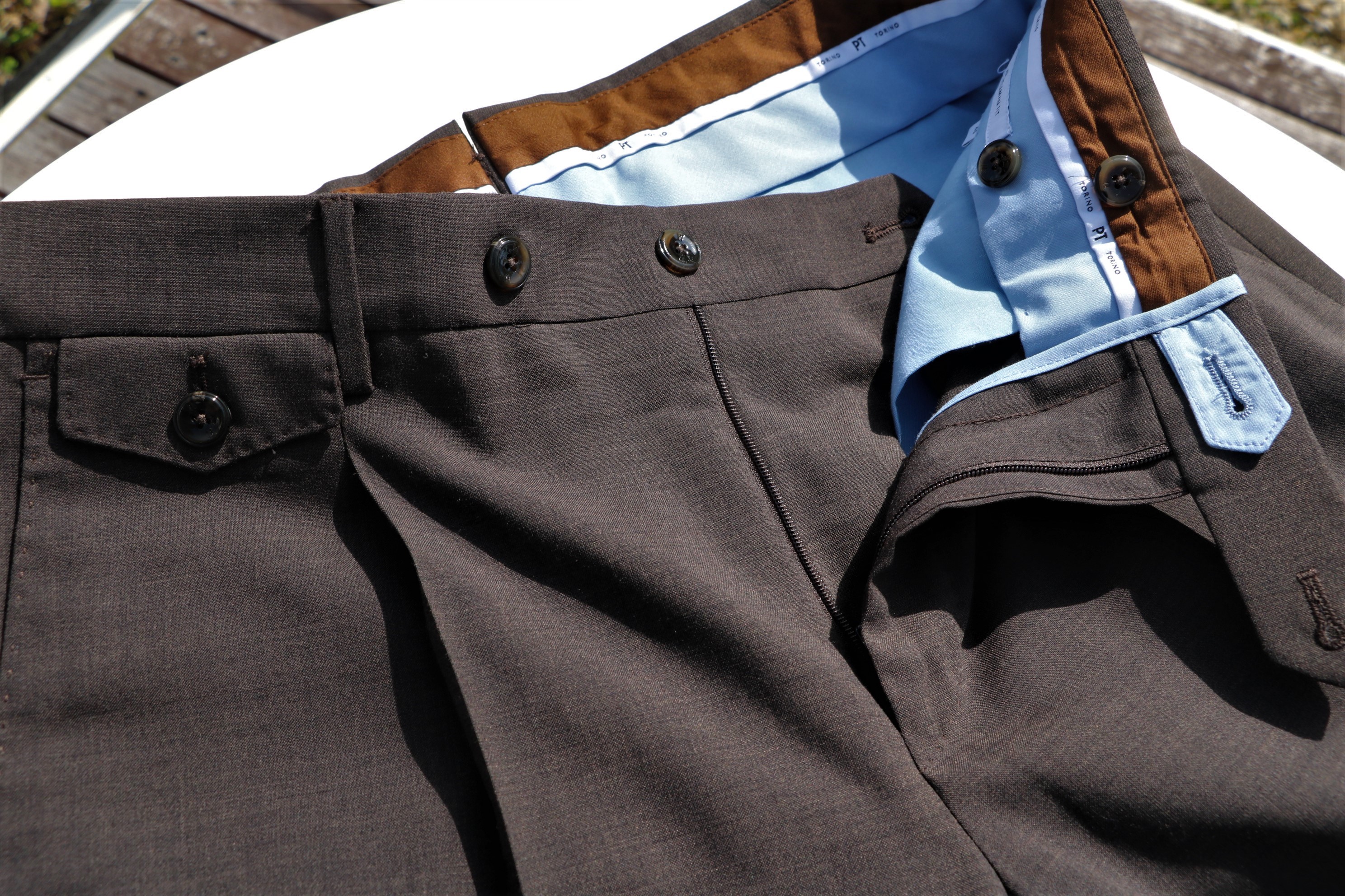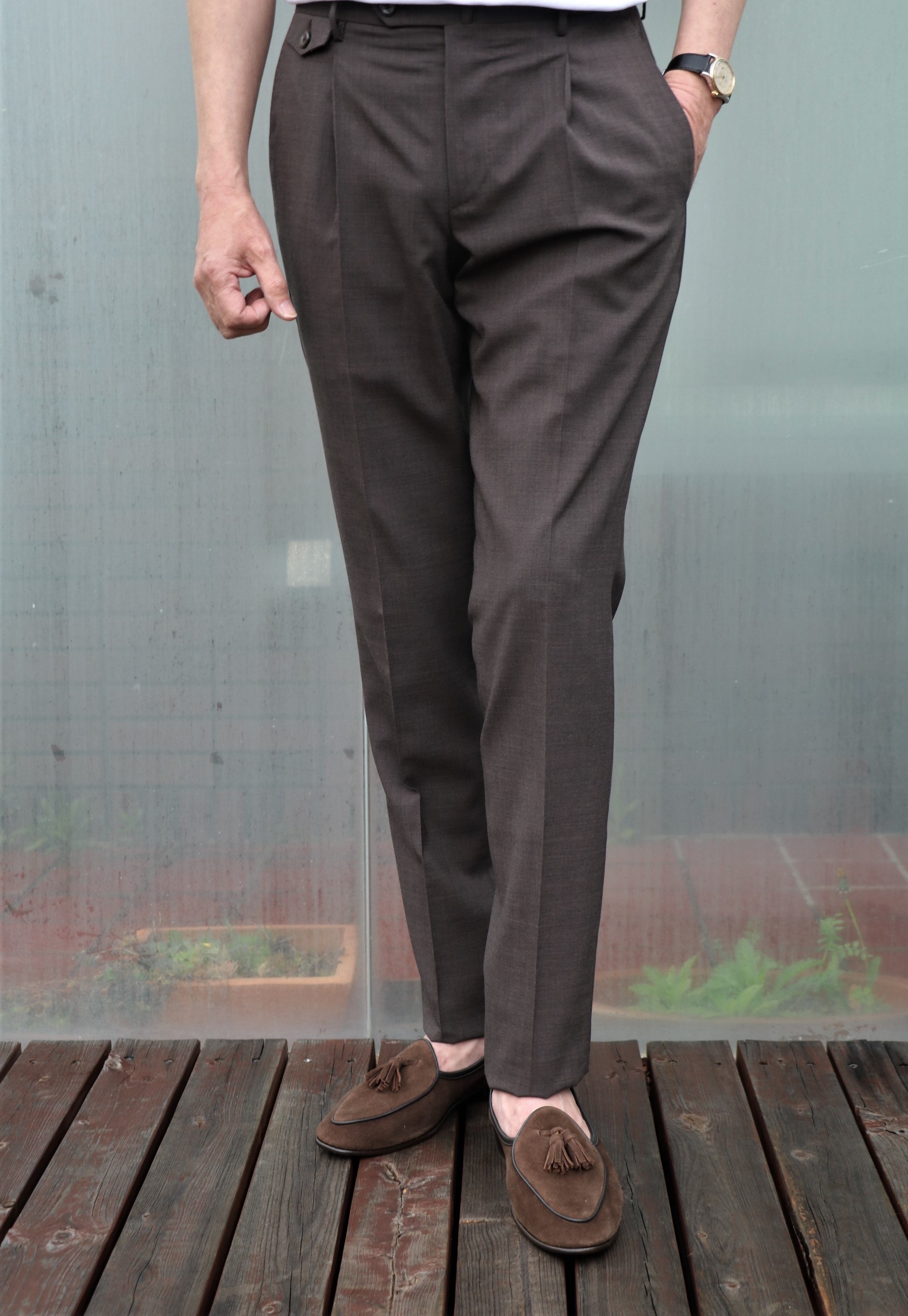 モデルは「GENTLEMAN FIT」。前回ご案内させていただいた、ウール98%・ポリウレタン2%のグレイとチャコールグレイ(ウォッチポケット付きワンプリーツウールパンツ)の色違いかと思いきや、こちらは、ウール54%・ポリエステル45%・ポリウレタン1%のTECHNO WASHABLE WOOL と、ややこしい。誰がバイイングしたんでしょうね。昨日、ベルトのご説明の際に使った "焼けた、焦がした"の意味がある「BRUCIATO/ブルチアート」の表現がぴったりのブラウンの濃淡が美しいパンツです。