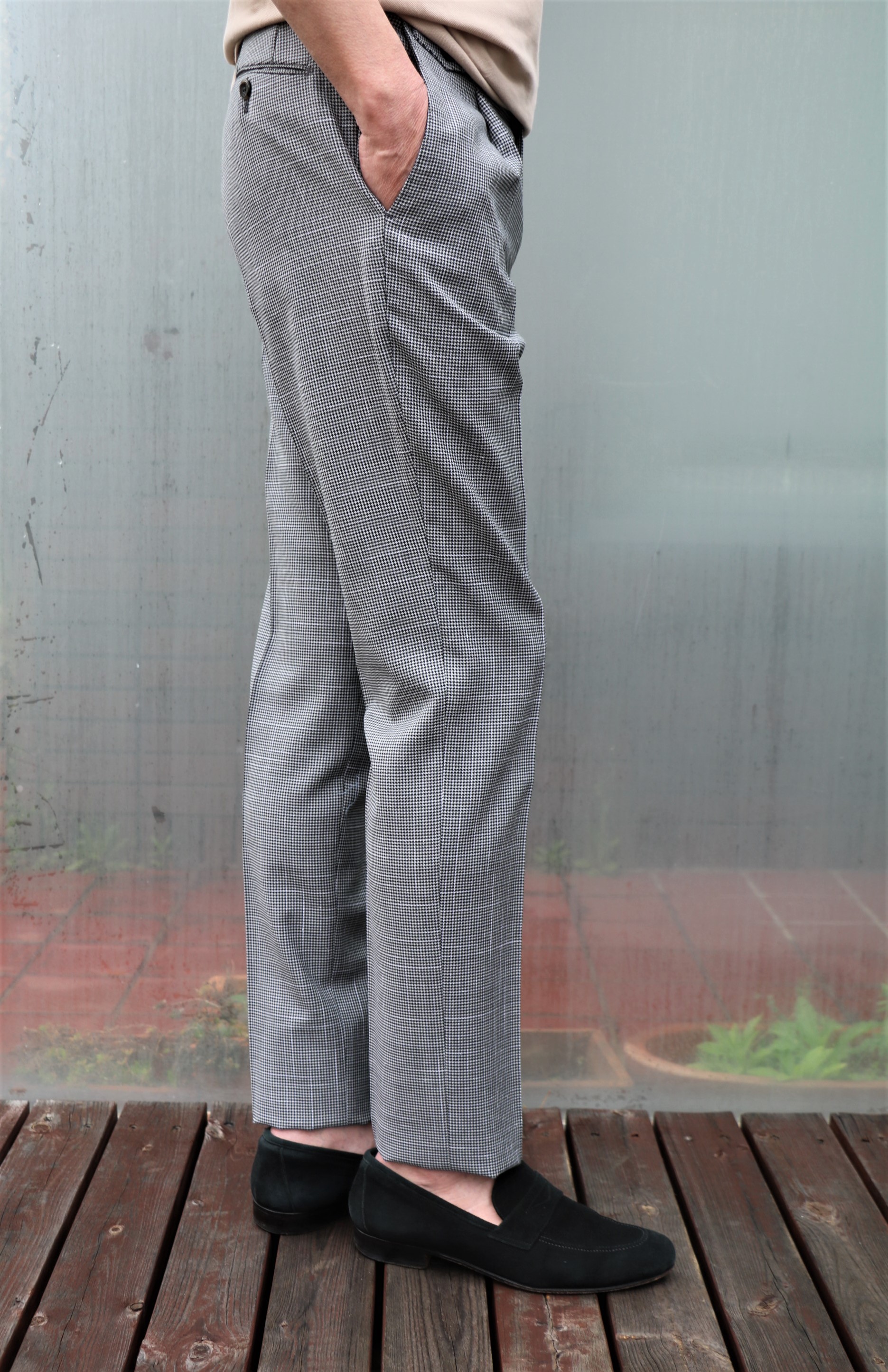 これは間違いありません。長年の指の感触が正しければ、ウール100%です。そう、ウールの中でも日常使うのに最も丈夫なSUPER100'S。もちろんクオリティの高さが前提の上での話です。セレクトの決め手は、色合いと柄行。言葉では説明しずらいのです、よく見るモノクロと違い、全体に柔らかな印象を持つハウンドトゥース柄。随所に縦横に掃いたような織柄が表情を豊かにしています。