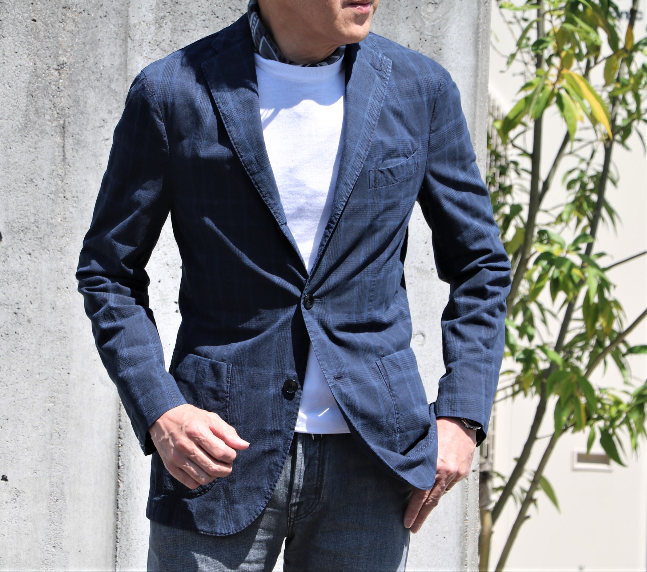 JACOB COHEN(ヤコブ コーエン)同様、長い付き合いになるだけに馴染みのある【BOGLIOLI/ボリオリ】。素材も昨日ご紹介のヤコブコーエンと同じコットン・リヨセル・ポリウレタンと混率の差はあるものの、偶然ともいうべきでしょうか。以前なら、モデル名は「COAT」、現在は「K.JACKET」の名で親しまれているガーメントダイ(製品染め&製品洗い加工)シリーズです。インディゴブルーの濃淡で織り成すチェック柄ジャケットです。前回、ご紹介させていただいたジャケットと共にご覧ください。