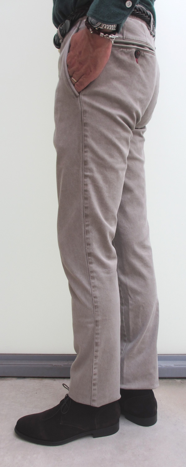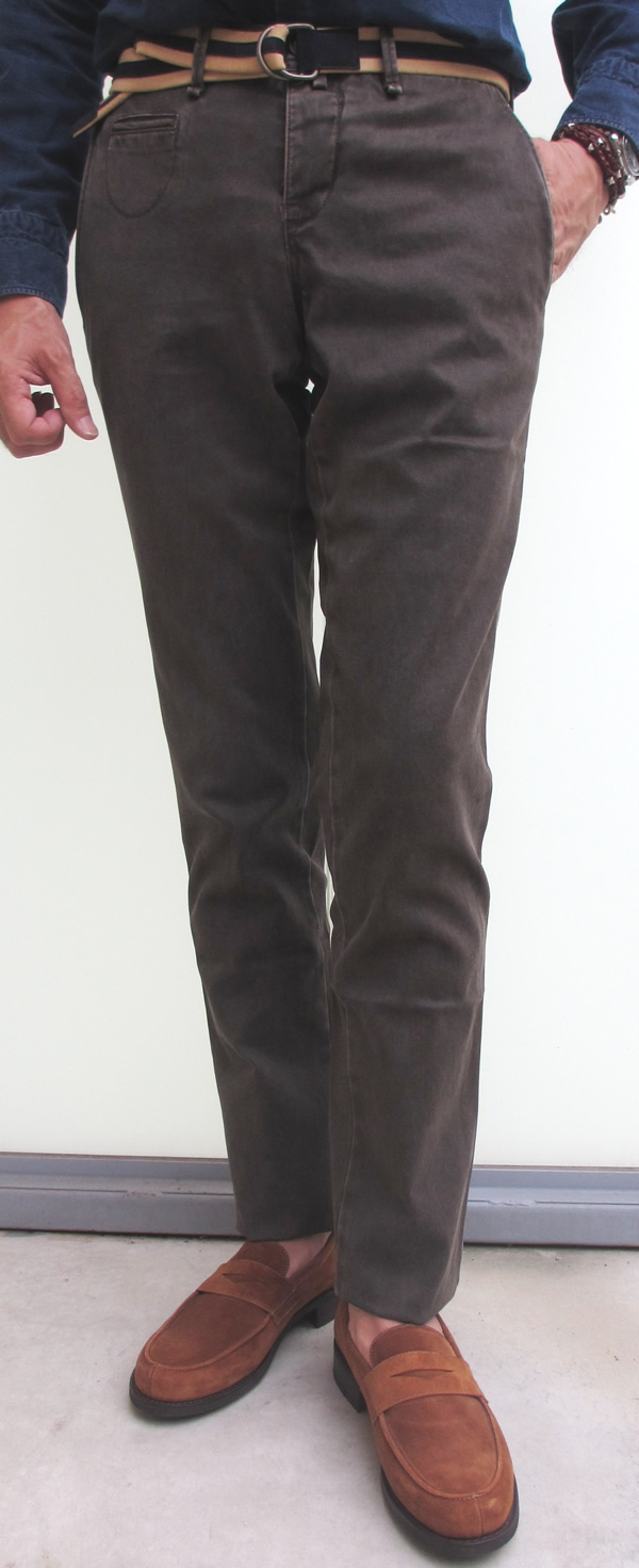 PT/ピーティーのコレクションの中で、ワーク&ヴィンテージをイメージしたライン【ICON/アイコン】。最近はカーゴが影を潜め、このシンプルな「Chino」でのセレクトが多くなりました。やや肉厚なチノ地に製品染め&製品洗いを施した味のあるパンツです。