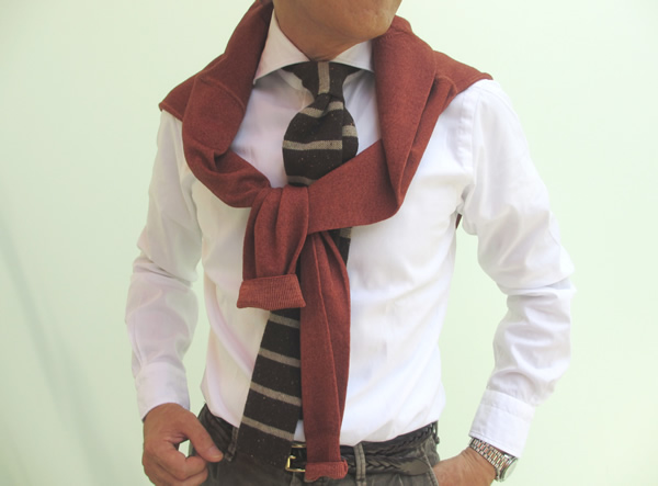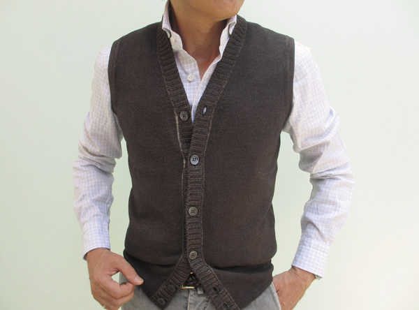 昨日ご紹介させていただいたBOGLIOLI/ボリオリのジャケットのインナーに合わせていたのが、こちら。【Cruciani/クルチアーニ】の定番ともいえる27ゲージのボディと9ゲージの前立てとの切り替え前開きベストです。ゲージの変化が、やや脇役的存在のニットベストを主役へと押し上げていきます。