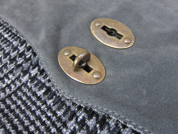こちらは、肉厚の重厚なグレンチェック生地に、外蓋はグレーのスエードレザー&アンティーク調の金具を採用しました。今季の英国的イメージにも、ぴったりなデザインに仕上がっています。