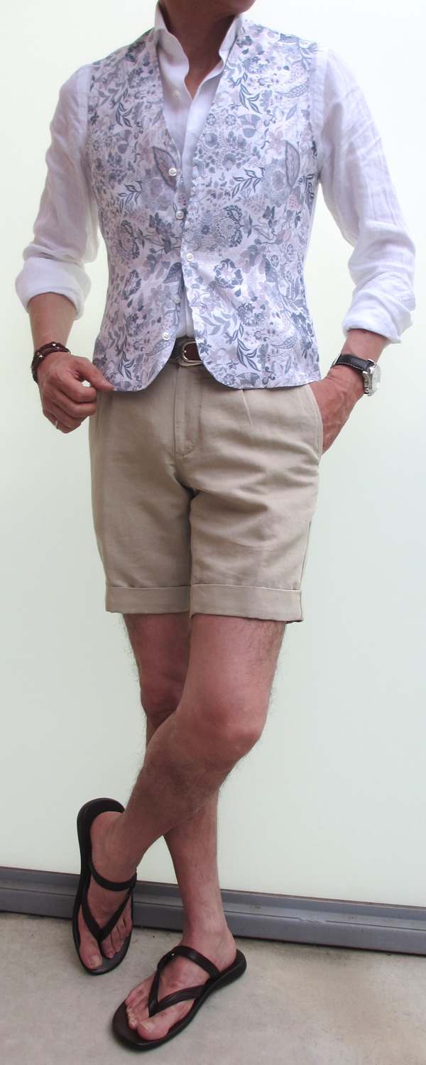 モデルは身長175cm、体重63㎏、胸囲91㎝でサイズ44をタイトに着用しております。写真左で合わせたショーツはINCOTEX (未公開)、右はSIVIGLIAの「WHITE」、シャツはどちらもMario Muscariello、サンダルはMAURO de BARIです。