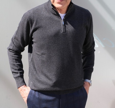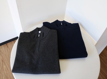 ウール70%・カシミア30%とタートルと同素材のジップアップのプルオーバーセーター。来年は、さらに色を増やして展開したいと強く思うのですが、来年のことはまだ分かりません。ただ確実に価格が上がるので、このニットも大切にご提案していきたいアイテムです。