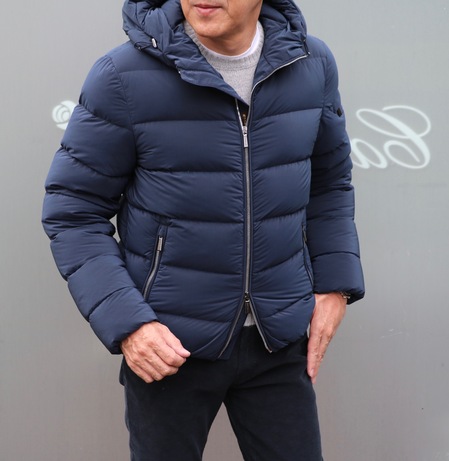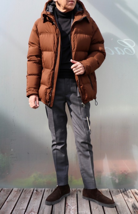 ただ、気に入らないことが一つ、いや気になることと言ったほうが良いでしょう。襟元につくのならまだしも、フードにファーを付ける必要があるのかどうか。価格もグッと上がってしまうし、どことなく大げさな感じ。それに、どうも似合わないのです。今日着ている、上の写真のMooRER(ムーレー)も、ファーだけを取り外せない為、フード自体を外してきています。そんな思いがあり、今回、選んでいるダウンジャケットにフードにファーがつくモデルは一点もありません。この好みは、ジュニアも同じようでして、彼が選んでいるPYRENEX(ピレネックス)にファー付きはありません。