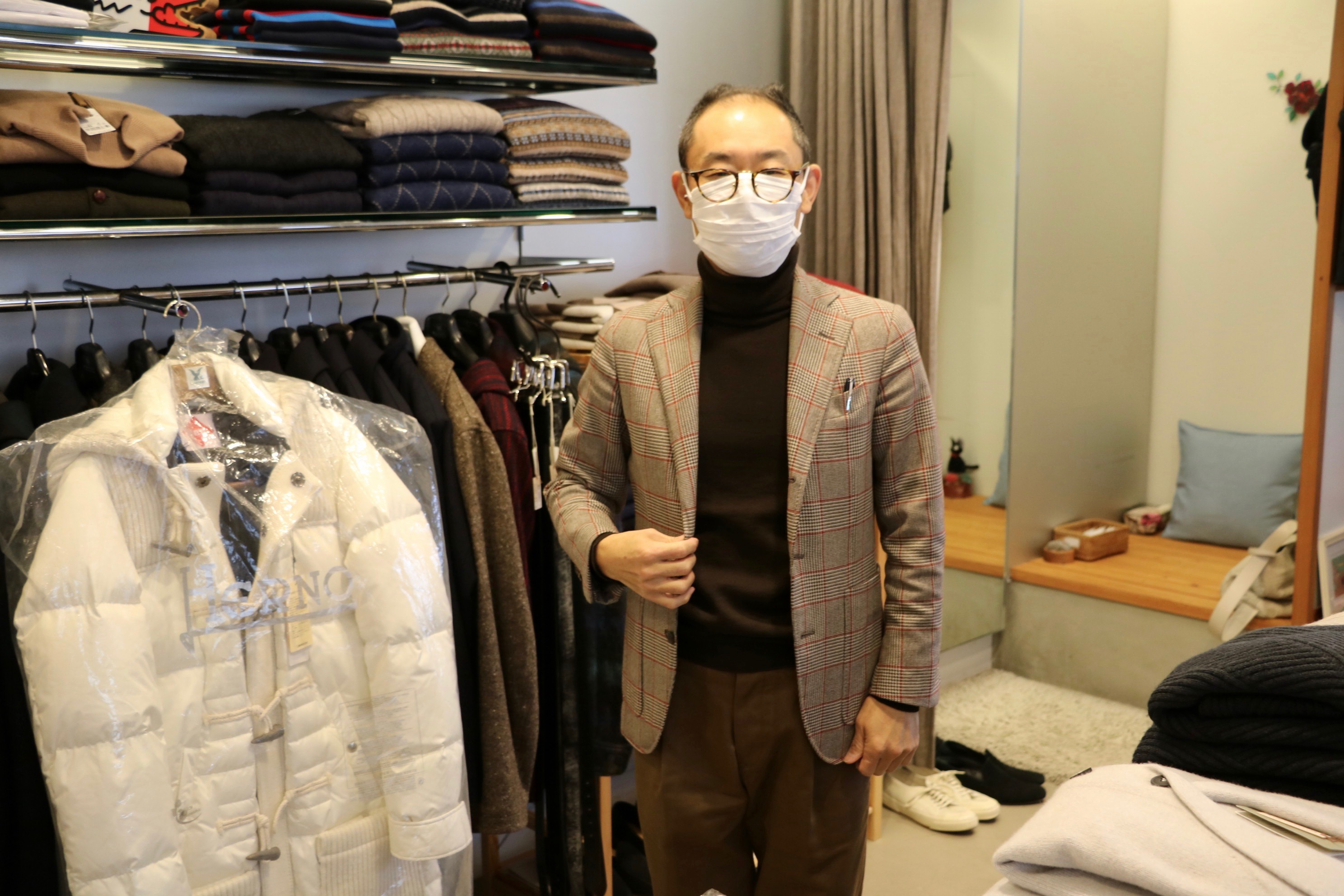 マスヤマくんが入る前は、三人。私が着ているのは、HERNO(ヘルノ)のファー付きフーデットダウン。ナグラさんだけウールです。