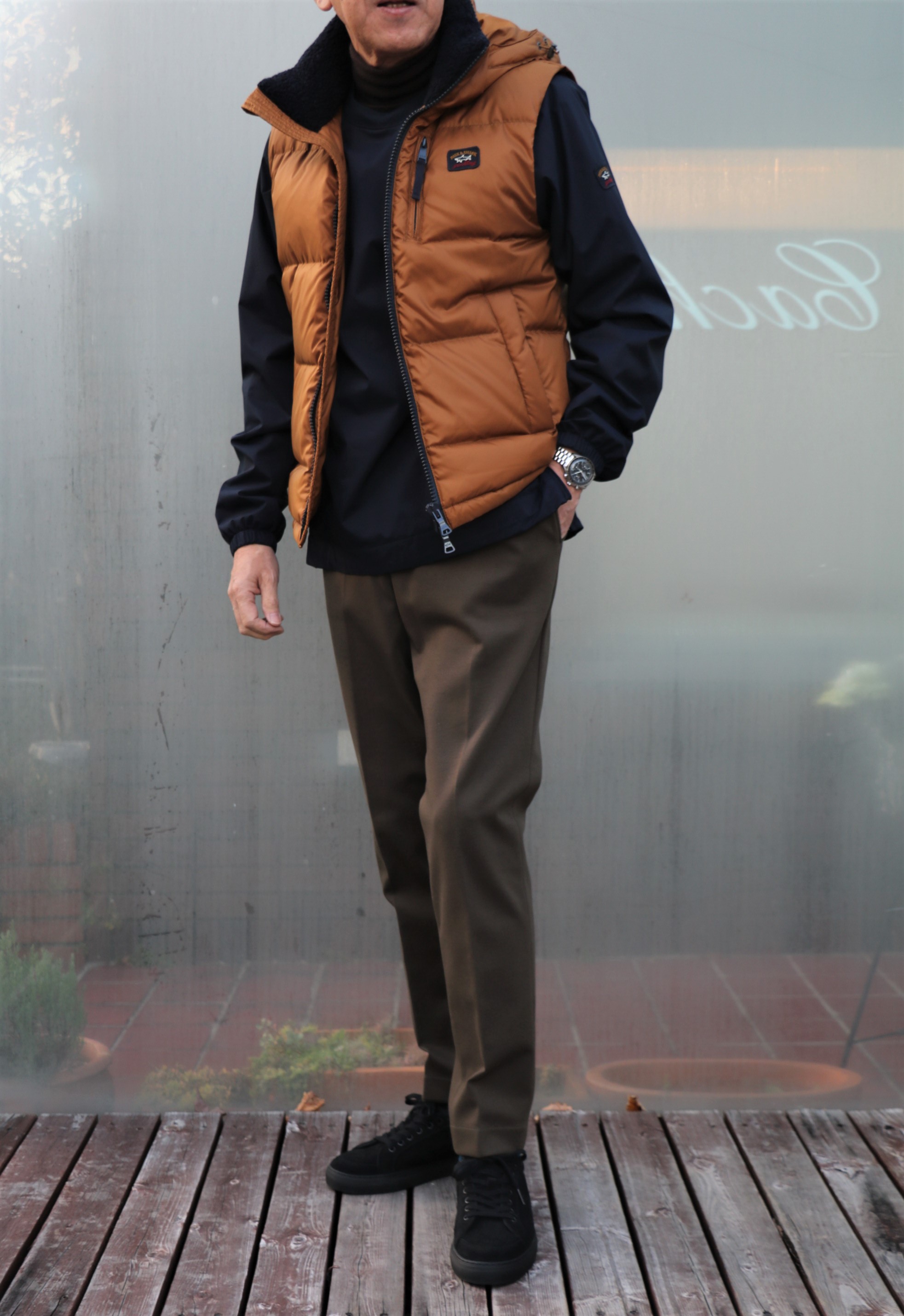ボトムをチャコールグレイにし、トップスをネイビーのワントーンで組み合わせたコーディネート。ブラックよりスポーティーで若々しい永遠の青春カラーのネイビー。再び注目が集まりそうです。選んだダウンジャケットは、【PYRENEX/ピレネックス】。少数派の為のYou Tube「SUGURU STORY by gloryguy」の中でも断トツの視聴回数を誇るフレンチダウンブランドです。気温が下がりだしてからの数字の伸びに、注目度の高さをうかがい知ることができます。