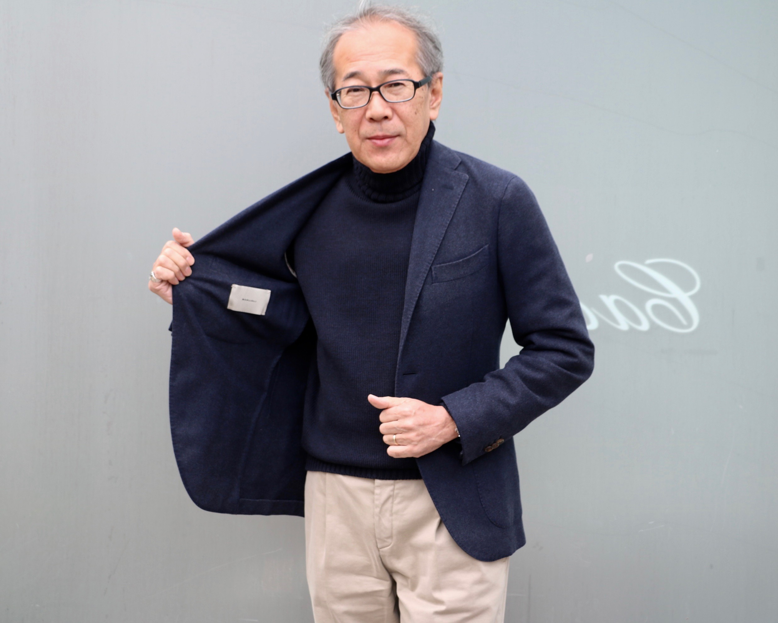 これもBOGLIOLI(ボリオリ)!! なんて、昨日の余韻を残しながらの自慢話ですが、カシミア素材にガーメントダイ加工を贅沢な「K.JACKET」。勢いのあるときに奮発して購入したジャケットです。オイスターベージュのチノパンにネイビーのドルチェヴィータ(ZANONE)を着て、何を羽織ろうかと探していたら、クローゼットの奥に隠れておりました。モノトーンコーディの多い、ここ数年。再び、ネイビーが気になりだしたのは、昨年。この時期の展示会中でした。久しぶりに着れば、「青春よ、もう一度」なんて気分になってきます。
