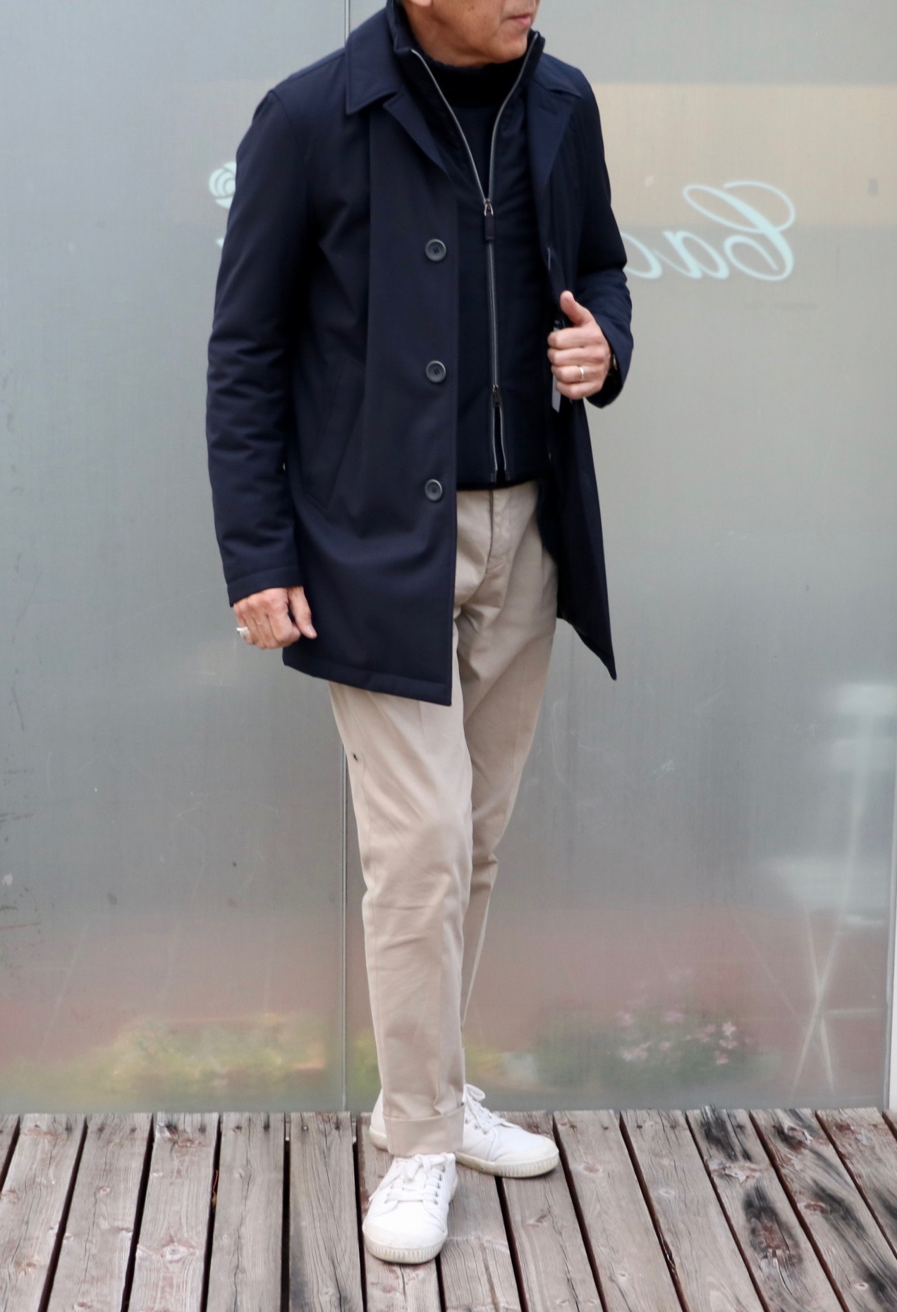 ボリュームを持たせない【HERNO/ヘルノ】のコンパクトなハーフ丈レイヤードコート。車の移動の多い地域でも、日常生活の中でさらっと羽織っていただけるシンプルなアウターです。こちらもブラックではなく、ネイビーを選びました。コレクションの中でもブラックのイメージが強いのは、スポーツモダンを提唱する「Laminar」シリーズ。トラディショナルな顔を持つベーシックなレギュラーモデルなら、やはりネイビーブルーが似合います。