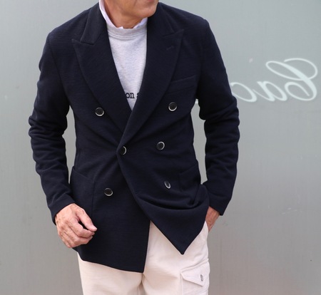 気軽にネイビーのジャケットに挑戦するなら【BARENA/バレナ】がお勧めです。ウール・ナイロンのストレッチジャージなら、ダブルブレストでも堅苦しさはありません。