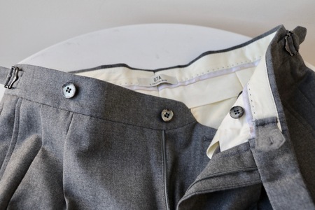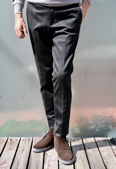 同じモデル「HERRICK」サキソニーグレイ無地パンツで、密かに狙っていたのが、ミディアムからライトのちょうど中間ほどのグレイ。明る過ぎれば寒々しい、ミディアムグレイでは、よくあるドレス寄りになることから、ちょうど良い色調のグレイを見つけたのです。サイズ46は全体の真ん中サイズだけに数は多くいれますが、こちらも早い時期に完売。さすが、見ている人は見てるんですね。諦めて、BARENA(バレナ)のグレイのセットアップを購入しましたが、こうして比べてみれば、似て非なるもの。来季も同じものがあれば、オーダーするつもりです。