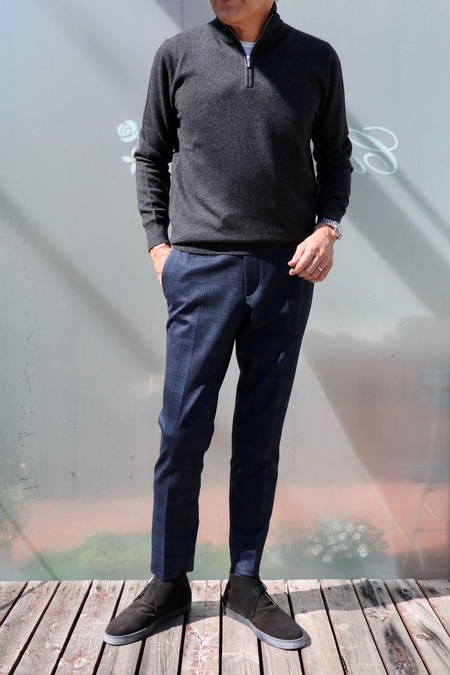 「DAVIDE」機能素材チェック柄イージーパンツのご案内の際に組み合わせたのが、この写真。昨日、あるニットブランドの展示会で勧められたのが、ハーフジップのプルオーバーセーター。「今、女性に人気があるんです」は担当者の声。「今季、展開しているよ」と自慢したら、「さすが、スグルさん。若い女性の心を掴んでますね」なんて言葉はありませんでしたが、かつて流行った襟型で、久しぶりに新鮮だから展開してみよう...がセレクト動機でした。展示会の後、街に出て女性を、いや女性の服装に気をつけてみれば、確かにニュートラルカラーのコートで身を包んだ女性のインに、このハーフジップを見つけることができました。