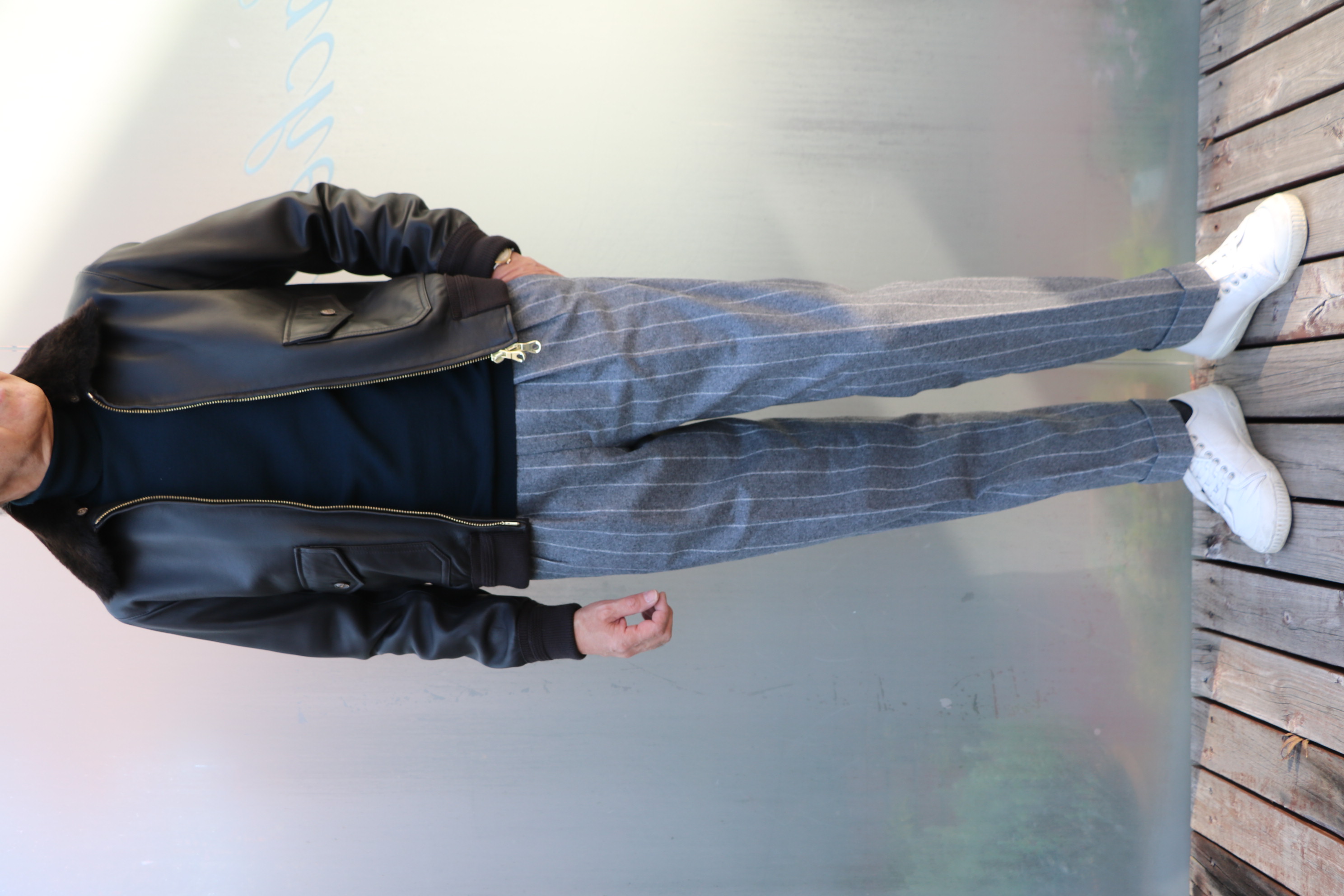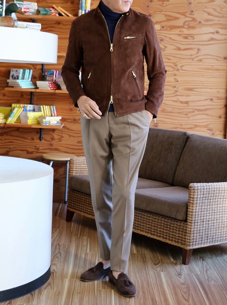 本日は、レザーにスポットを当てて、ご提案していきます。まずは私物のご紹介を。パンツはお気に入りBERNARD ZINS/ベルナールザンス。「BAC J」というモデルで、ツーインプリーツのクラシックなフロントから、ゆったりとストレートに落とし込んだワイドモデルです。フランネルの幅広のバンカーストライプ柄はスーツにみるクラシックな柄行きですが、このシルエットならスニーカーでも合わせることができます。サイズ40で着用。ニットは、今週の出張のため、揃えたJOHN SMEDLEY/ジョンスメドレーの「CONNELL」。24Gメリノウール タートルネックセーターです。もう10年以上着ていたブラックがついに虫食い。ごまかしながら着ていたのですが、さすがに恥ずかしい。同じ色を選ぶつもりが横に並んでいたオリオングリーンに魅了。サイズMの重複在庫があるということもあり、初めての色に挑戦です。