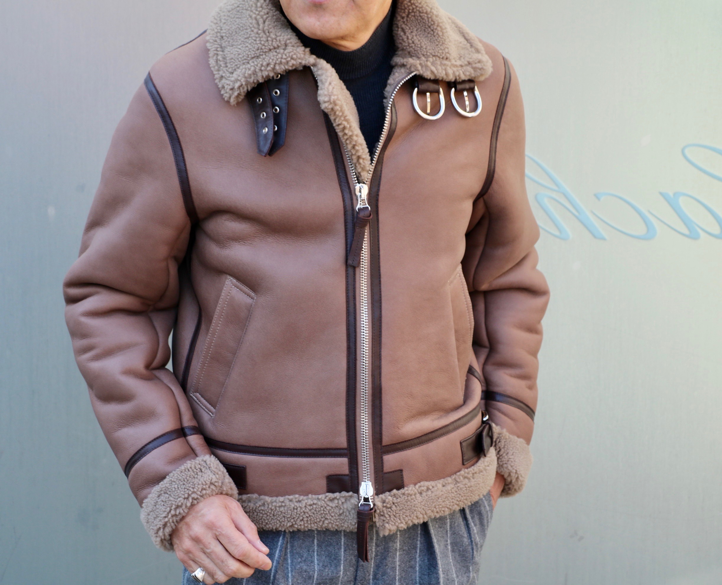着用したのは【CINQUANTA/チンクアンタ】のシープスキン G1 フライトジャケット。大好きなモデルです。似たモデルを持っているのに欲しくなってしまうのは、ボアの温もりと襟の立ち具合が男らしい。私のはボア無しで、あるメゾンブランドのファクトリー。襟位置が低く、やや女性的なんです。それはそれで気に入っているのですが、やはり漢(オトコ)はタフでなければいけません。