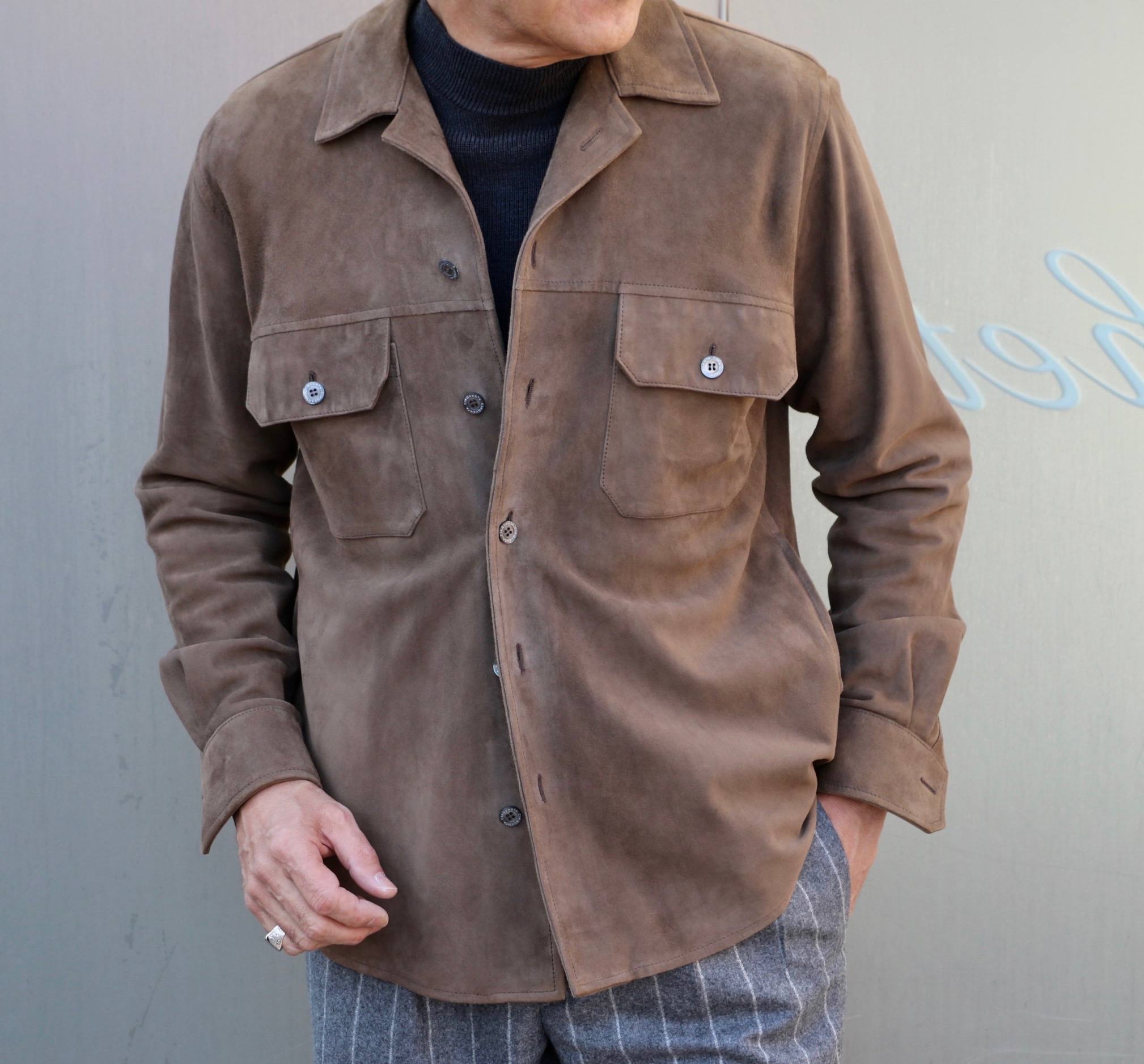 残すところ一点。不思議と中心サイズの46があるのは、同じく【CINQUANTA/チンクアンタ】のゴートスウェード サファリシャツ。秋口から羽織りものとして、真冬はハイゲージのニットに合わせ、出かける際にはアウターやコートが羽織れます。そして春先までとシーズンの長いレザーアイテムです。