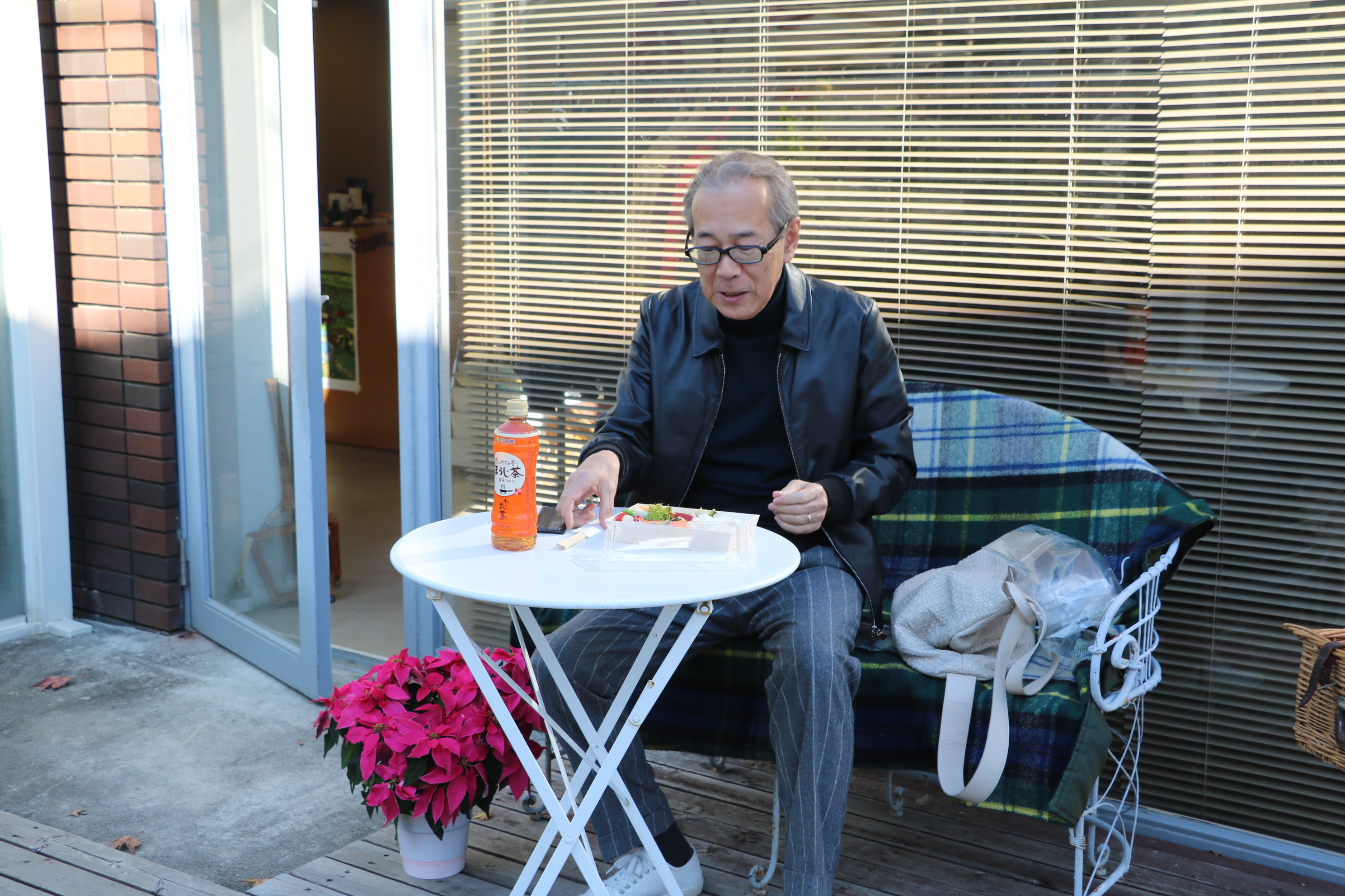 ロケ弁です。レディースのブログ写真を撮り終えた後、あまりの天気の良さに、ついついカシェートテラスで弁当を開いてしまいました。いつもなら近くの飲食店で昼食ですが、この日、なぜかジュニアが知人の弁当屋さんで私の分まで買ってきてくれたのです。ただ日差しが陰ると寒く、早々に退散です。日差しの有る無しでは随分と体感温度が変わります。まだまだ続く展示会。そして年末の慌ただしさを前に、体調管理には十分に気をつけないといけません。