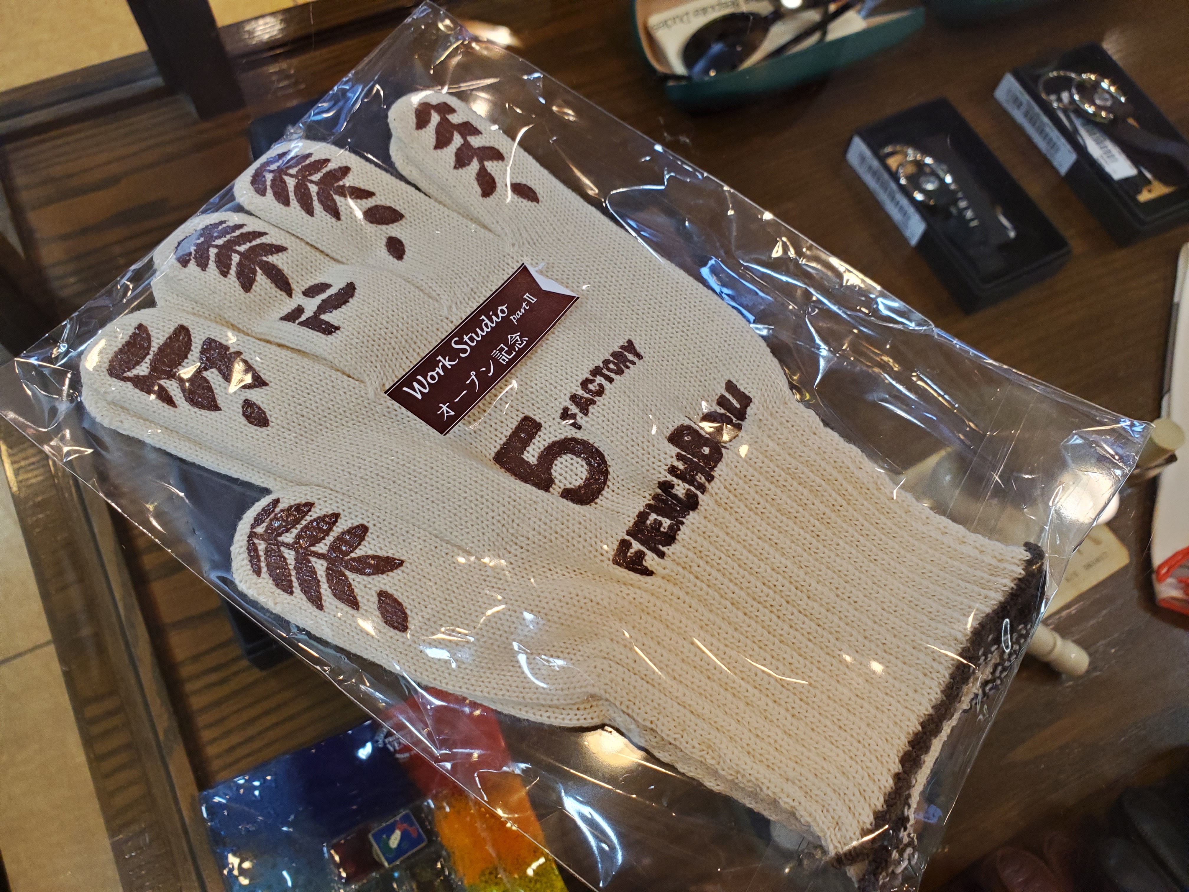 レジでいただいた記念品が、こちらの軍手。かつて叔父が繊維工場を経営しており、海外のものに負けじと高品質の軍手を全国に卸していただけに、何かの縁?は、大げさな言い方でした。迫力のある建物ですが、店内は繊細なものが多い"5 FACTORY"。是非みなさんものぞいてみてください。もしかすれば、明日の中日新聞の三河版か県内版に店内の様子とともに私たち親子が登場するかもしれません。