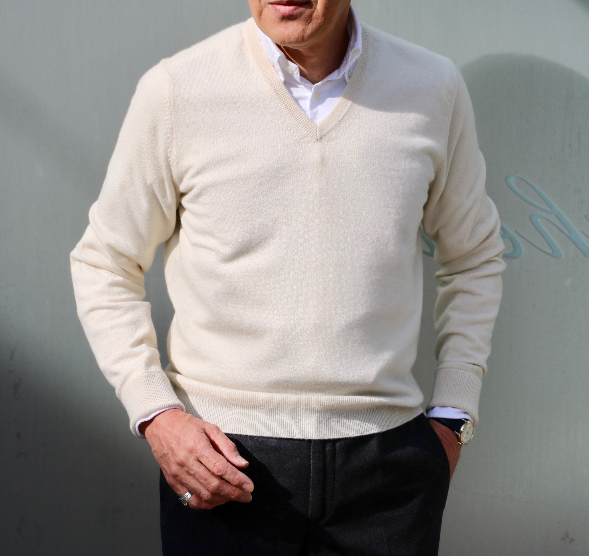 ZANONE(ザノーネ)のスノウホワイトに比べてエクリュがかったアイボリーホワイト。今年はVネックが欲しいとDrumohr(ドルモア)の展示会で真っ先に選んだカシミアのVネックニットです。白のB.Dシャツとの組み合わせは、この上にバラクータのG9を羽織ったスティーブ・マックイーンに魅せられてのことです。ところで、どこの白のシャツかの説明がまだでしたね。本家ブルックスブラザーズを凌ぐ北イタリア・ヴィチェンツァのGUY ROVER(ギ・ローバー)のものです。着ているのは、私物。撮影のために着てきたら、お馴染みさんの目にも止まり、ご購入されて行かれました。確か、その方も白のニットを着ておられたかと。多分、彼もスティーブ・マックイーンに憧れていたりして...