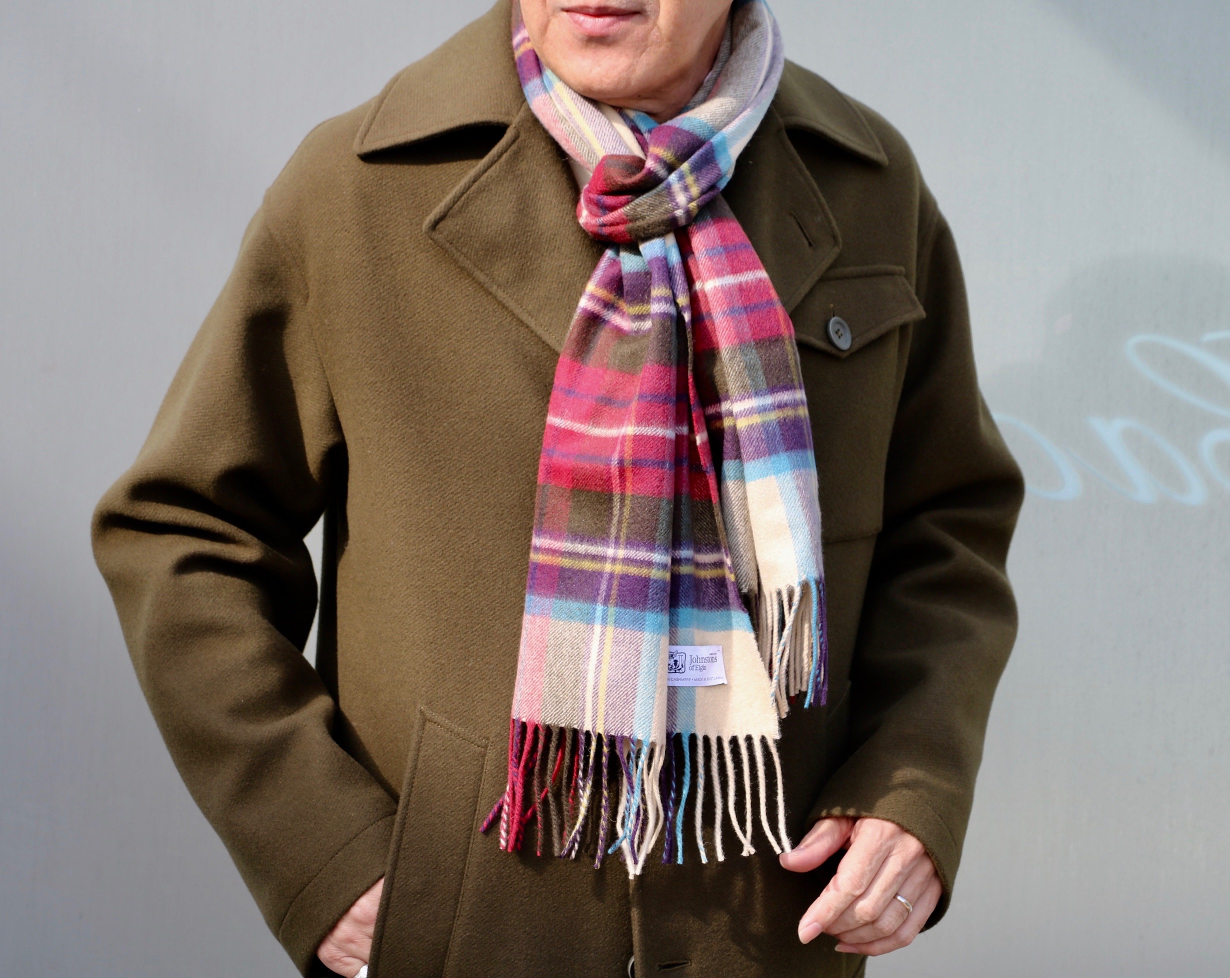ミリタリー調のコートで男らしさを演出しても、自然と優しさが滲み出るのが、HERNO(ヘルノ)。レディースで人気があるからでしょうか。ならば、いっそさらにマフラーでフェミニンさを味付け。巻いたのは、JOHNSTONS OF ELGIN(ジョンストンズ)のカシミアマフラー。実は、このチェック柄の「Hessian Dress Stewart」。大判でカミさんが持っており、さりげなくペアルック...
