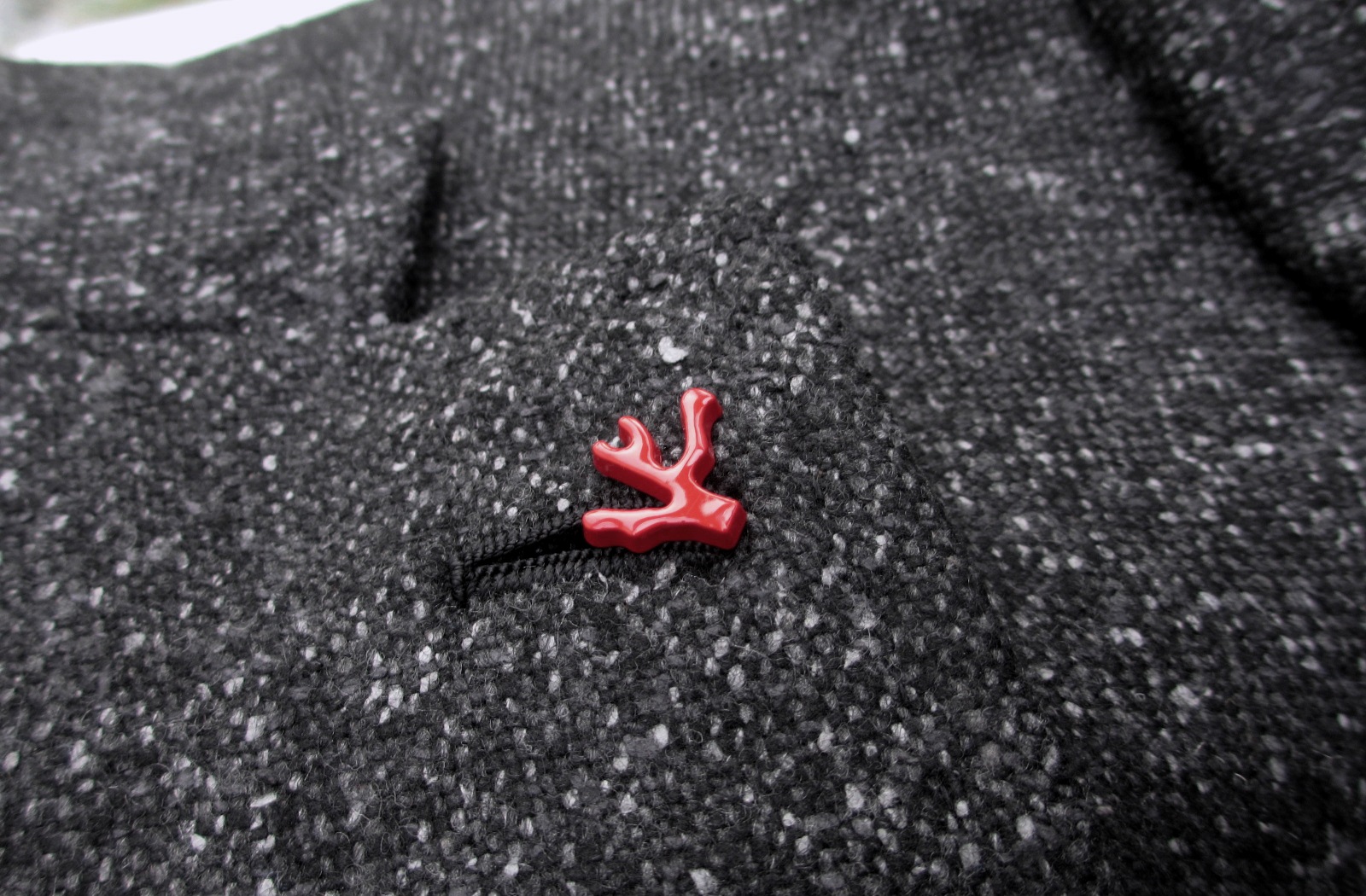 既にご紹介済みの「三者混紡ドネガルジャケット」に羽織ったのは、ピークドラペルのシングルコート「PORTOFINO」。ブラックでセレクトです。オケージョンシーンにはもちろん、勝負服?、いや、イザという時には、ぜひ着て行きたいコートです。
