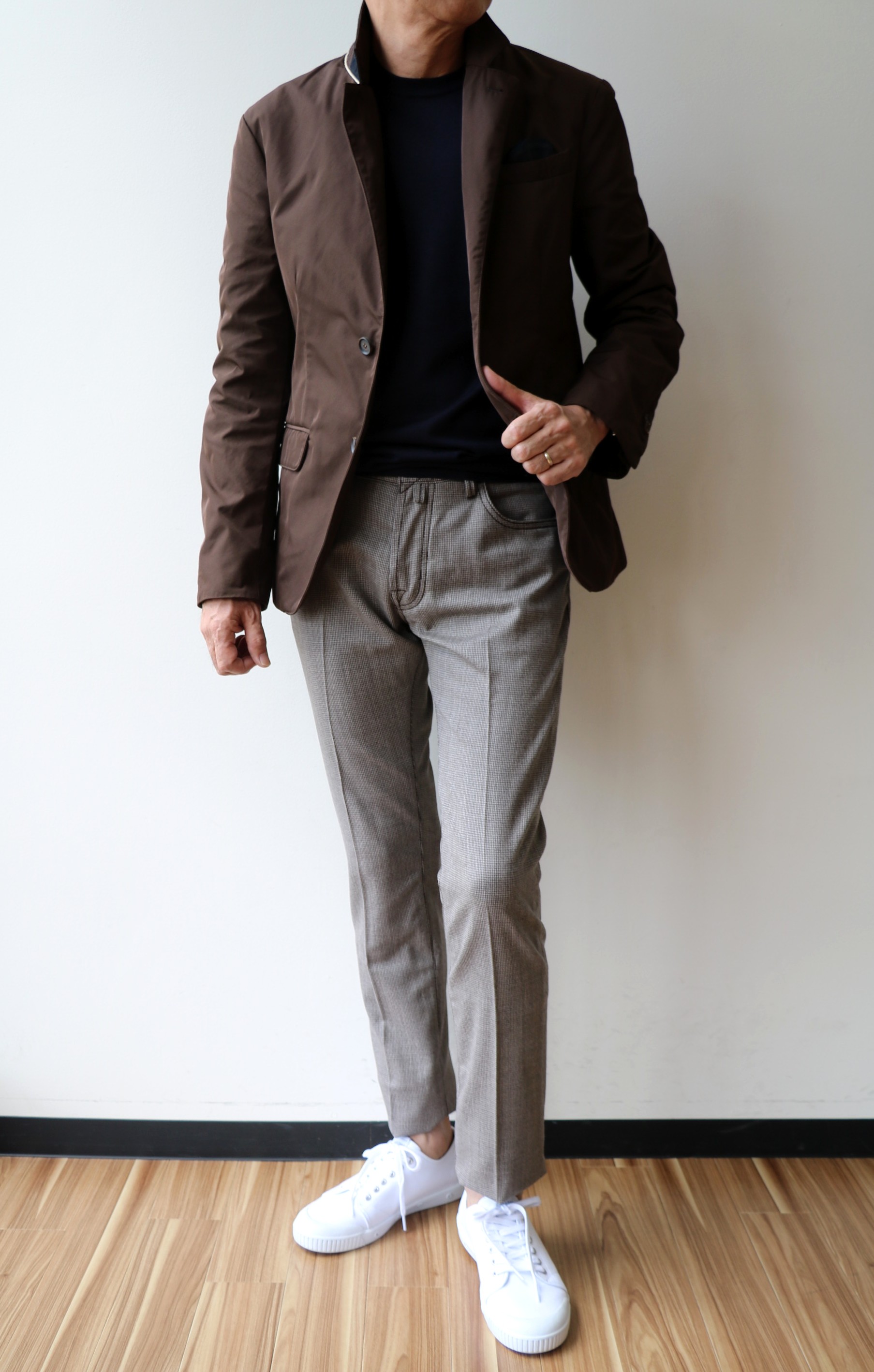 そして色違いのネイビー。夏の青より、くすんだ深みのある色合いです。インナーは同じSettefili Cashmere(セッテフィーリ カシミア)のポロニットを使い、次回購入に狙いを定めているFORTERA(フォルテラ)のブルゾンを羽織り、足元は再入荷のSpring Court(スプリングコート)と、ネイビー×ブラック×ホワイトの組み合わせです。昔なら合わせなかったネイビーとブラック。でも今、とても新鮮な色合わせに感じています。黒に合う青だからかもしれません。