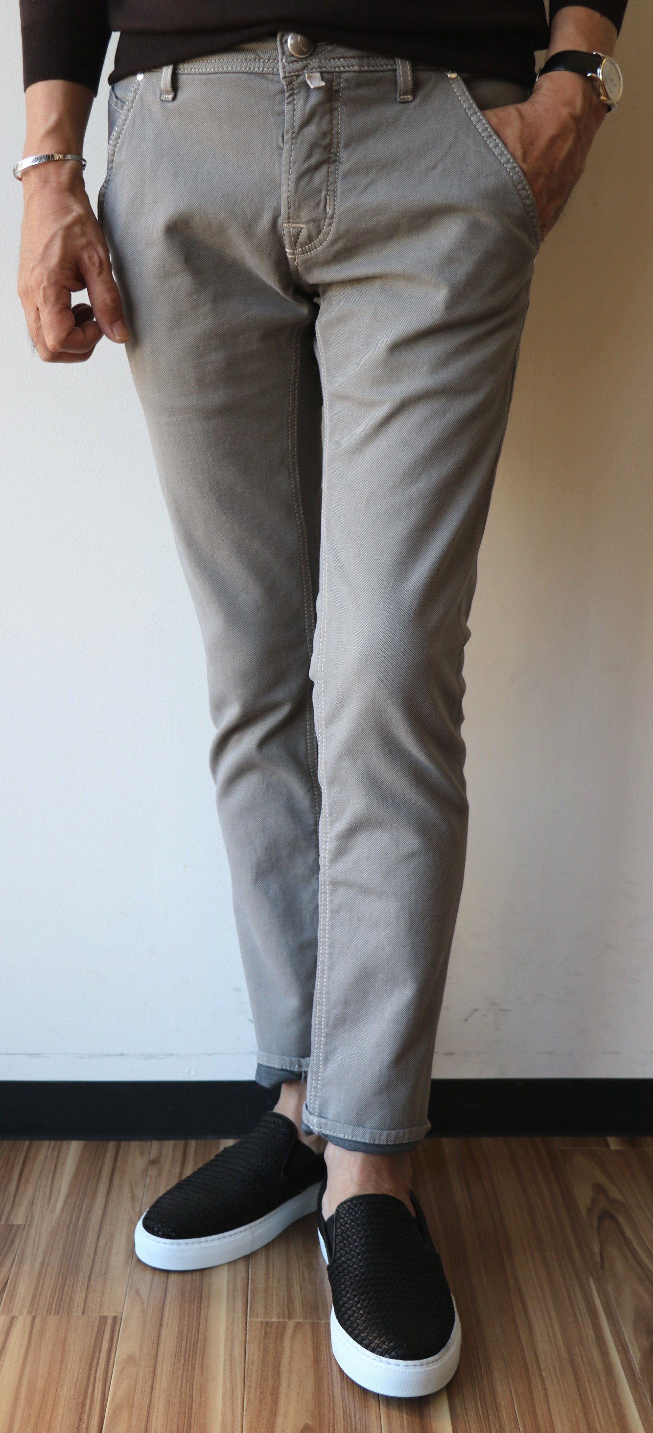 モデルは「J688」は、股上やや深めの程よいテーパードスリム。安定感のあるフィット感です。3万円台が殆どないヤコブにあって、46,000円という価格も魅力的です。