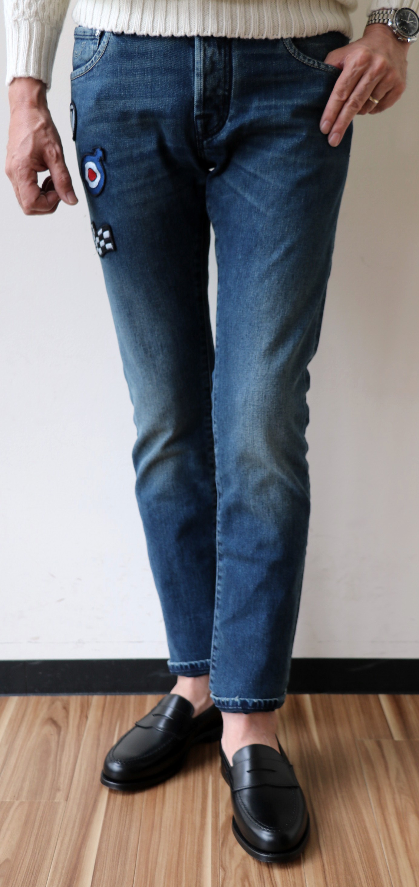 最後は、再入荷のご案内です。イタリア本国よりトレンドに敏感な日本での人気が高いスラントポケットの「J666」モデル。股上は深めで、ワタリに少しゆとりを持たせたテーパードシルエットのキャロットフィット。程よい厚みをもったデニムらしい生地とインディゴブルー。また金茶のヘリンボーン柄バックパッチとカモフラージュのチーフ、そして裾の折り返しステッチがアクセントとなっています。
