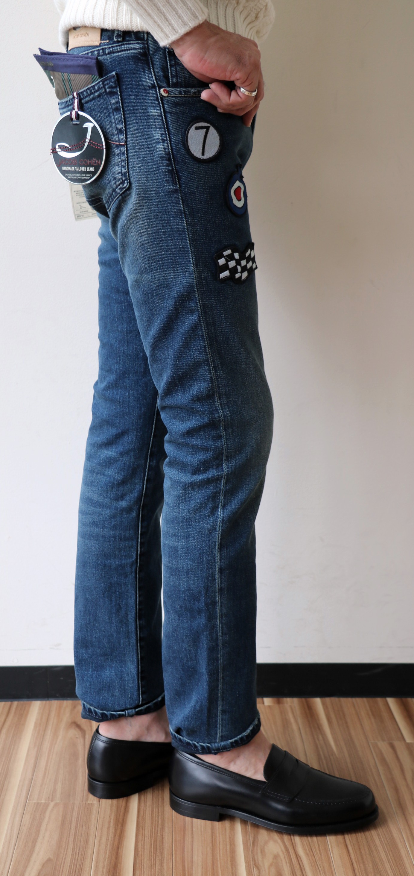 前置きが長くなりましたが、それにはそれなりの理由があってのことです。話を結び付けますね。FORTELA/フォルテラのエージェント角田氏は、もとVAN出身。その後、スキャッティ・オークの大阪支店長を経て、「N.K.クラシック」として独立。「N.K.」とは、氏のイニシャルです。当時、ドメスティツクブランドやインポートブランドのライセンスものを中心に展開していた頃、"これからは本物志向の時代だよ"と紹介してくれたのが、スーツ&ジャケットのカンタレッリやニットのナポレオンエルバ、パンツで言えばマビテックス、シャツはダノリスと、今まで聞いたことのないファクトリーブランドばかりでした。若い世代の方にとっては、聞き慣れない名前ばかりですが、同世代には懐かしい話ですね。いつもネイビーを中心にしたコーディネートが素敵で、お手本にしていたのは私だけではなかったはずです。ある時、イタリアのジーンズブランドを欲しがった私の我儘を聞いて、持ち帰ってくれたのが、今からご紹介する【JACOB COHEN/ヤコブ コーエン】だったのでした。昔話は、ここまでにしましょう。