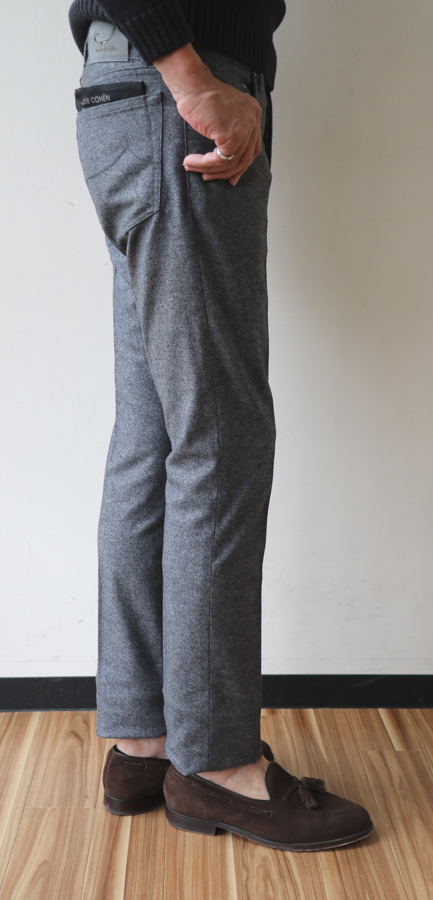 9月16日のブログでご案内させていただいた「ダークブルー ウール5Pパンツ」の色違いではありません。モデルは、同じ「J688 WOOL」ですが、柄行きは、細かなホームスパンになります。イメージする固めの生地と異なり、カシミア混とストレッチ素材が入ることで、穿き心地は、しなやかでソフトです。