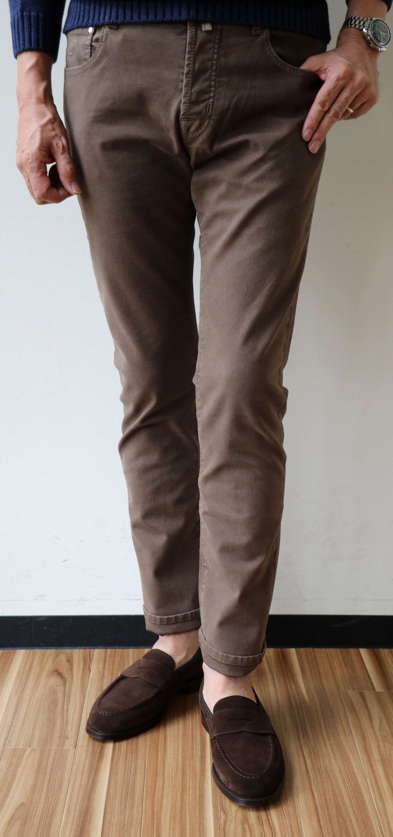 あれっ!です。ルールを決めたばかりなのに...ですが、このコーディネートだけ、昨日の出で立ちに合わせて撮影したものでして、掟違反をお許しください。シャツはBAGUTTA(バグッタ)、パンツは噂のBorelio(ボレリオ)。今日も穿いている、きちんと見えて超楽チンパンツ。再入荷分が分納になってしまっており、来週末には品切れのサイズ44も揃うかと思います。