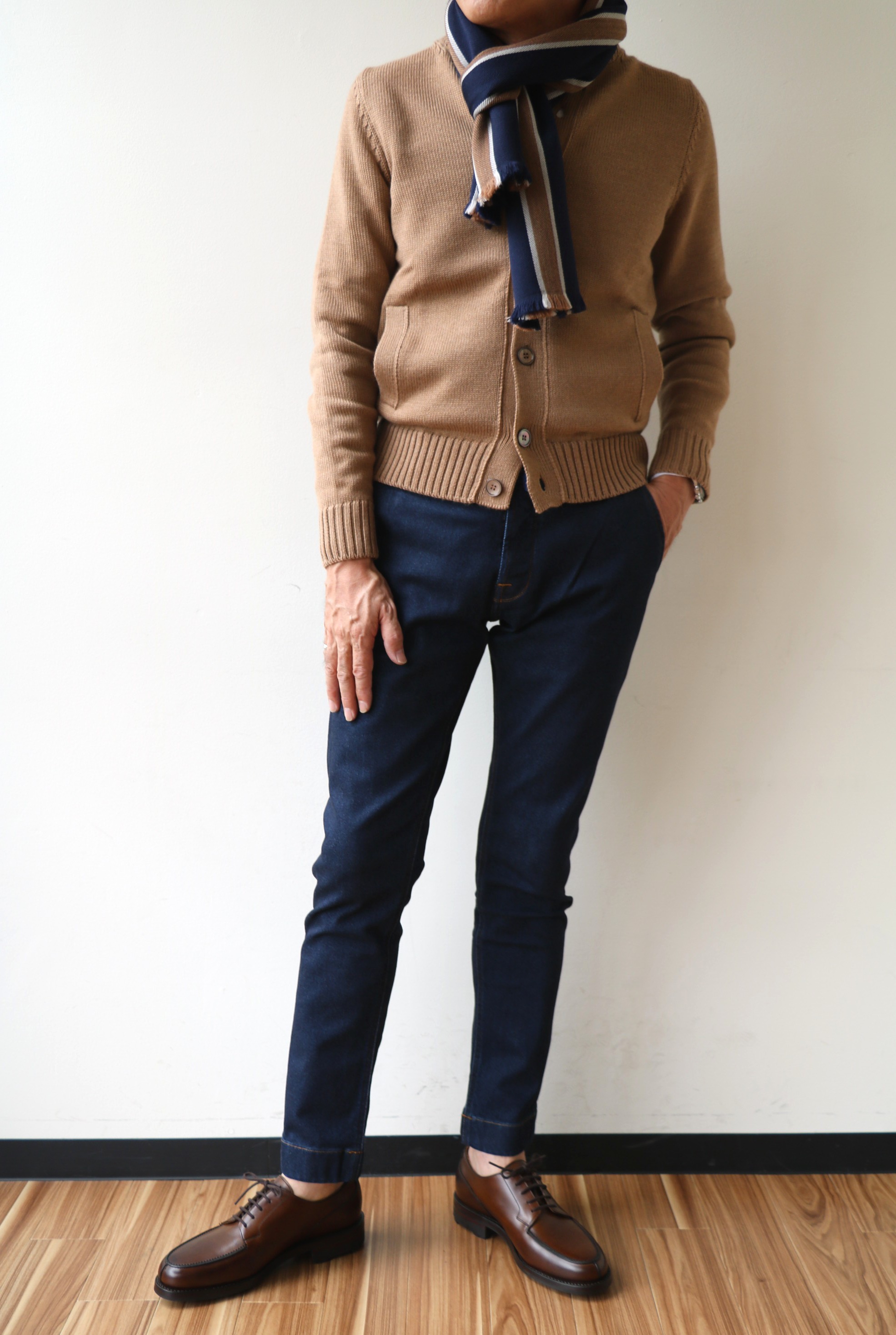 ルールを守る男、スグルではありませんでした。ZANONE(ザノーネ)のニットは着たのに、HERNO(ヘルノ)を羽織っておりません。代わりに、未公開のFRANCO BASSI(フランコ バッシ)のマフラーを巻いております。靴だけは、CROCKETT&JONES(クロケット&ジョーンズ)と、なんとか最後まで守り抜きました。