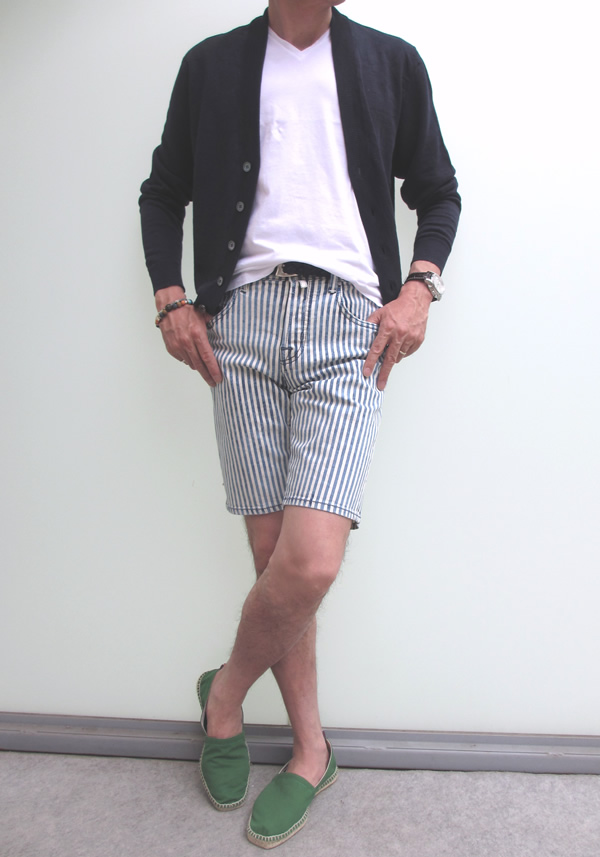 モデルは身長175㎝、体重63㎏、胸囲91㎝で、サイズ30を穿いております。コーディネートで合わせたTシャツはthree dots、カーディガンはDrumohr、ベルトとブレスレットはD'AMICO、靴はCastaner(未公開)です。