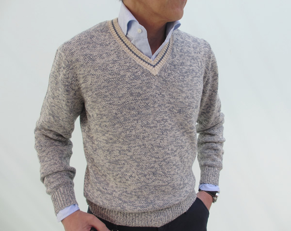 【massimo alba/マッシモ・アルバ】、最後のご紹介は、大好きなメランジ調のライン入りVネックセーター。どうもメランジとラインに惹かれるのは、ZANONE(ザノーネ)の「KYOTO」でも同じ。メランジの渋さとラインの若々しさ。特に、この甘~い色合いの誘惑には負けてしまいました。実を言うと、セレクトの要因になったが、このニットなんです。
