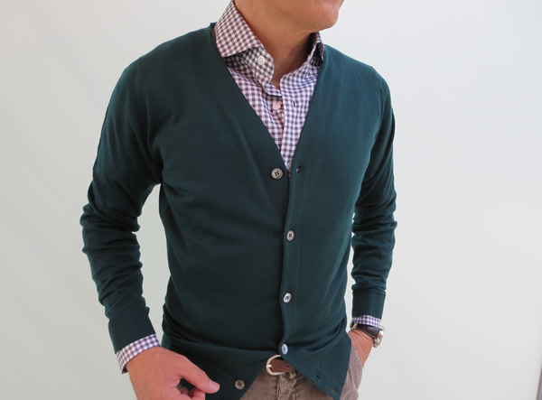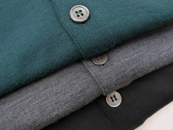 こちらも新型カーディガンの「SANDOWN」。昨年展開の「BRYN」よりスリムになり登場です。サイズ以外に大きな違いは、前立て部分。編地の切り替えが見えない裏前立仕様になり、こちらもエレガントな顔に変身です。