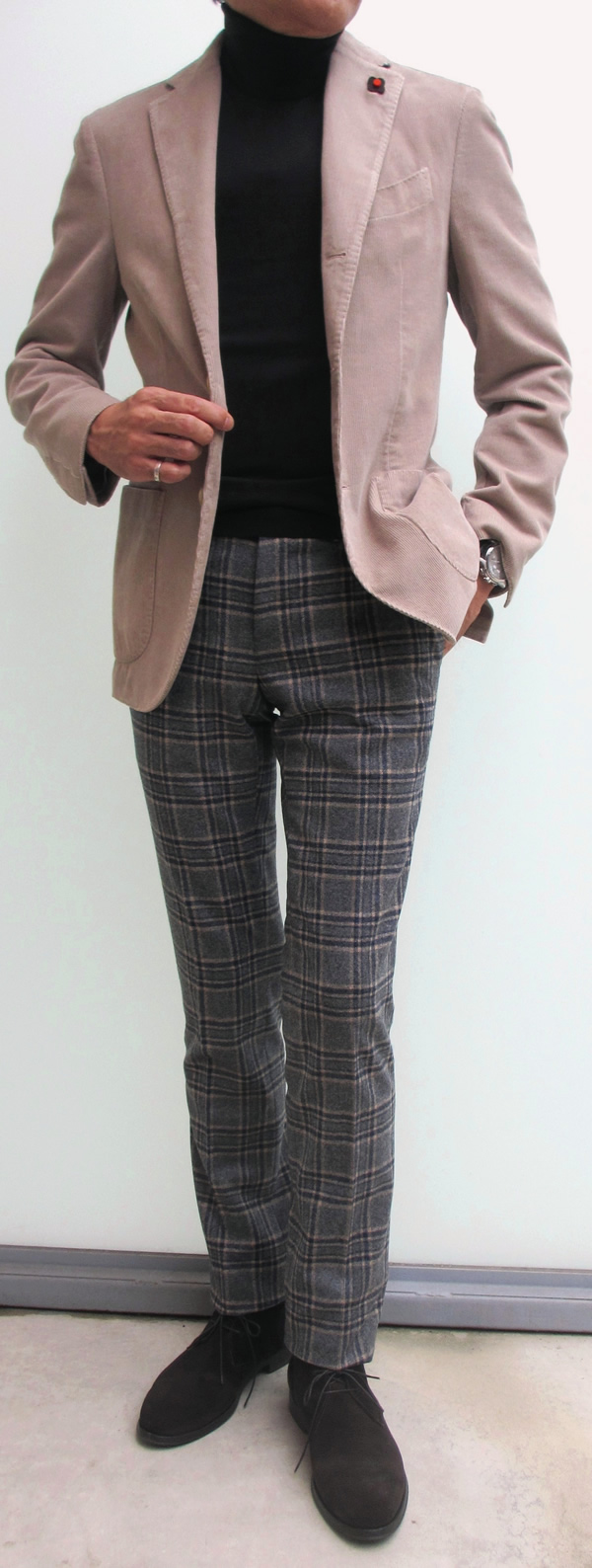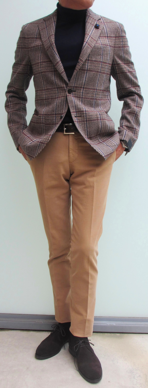 モデルは身長175cm、体重63k、胸囲91㎝でサイズSを着用しております。ミッドナイトネイビー(左)のコーディネートで合わせたジャケットはLARDINI、パンツはINCOTEX(未公開)、靴はDOUCAL'S。チョコブラウン(右)はLARDINI(コーデュロイスーツの上着)、パンツはPT01の「Fulham Rd.」、靴はDOUCAL'Sです。