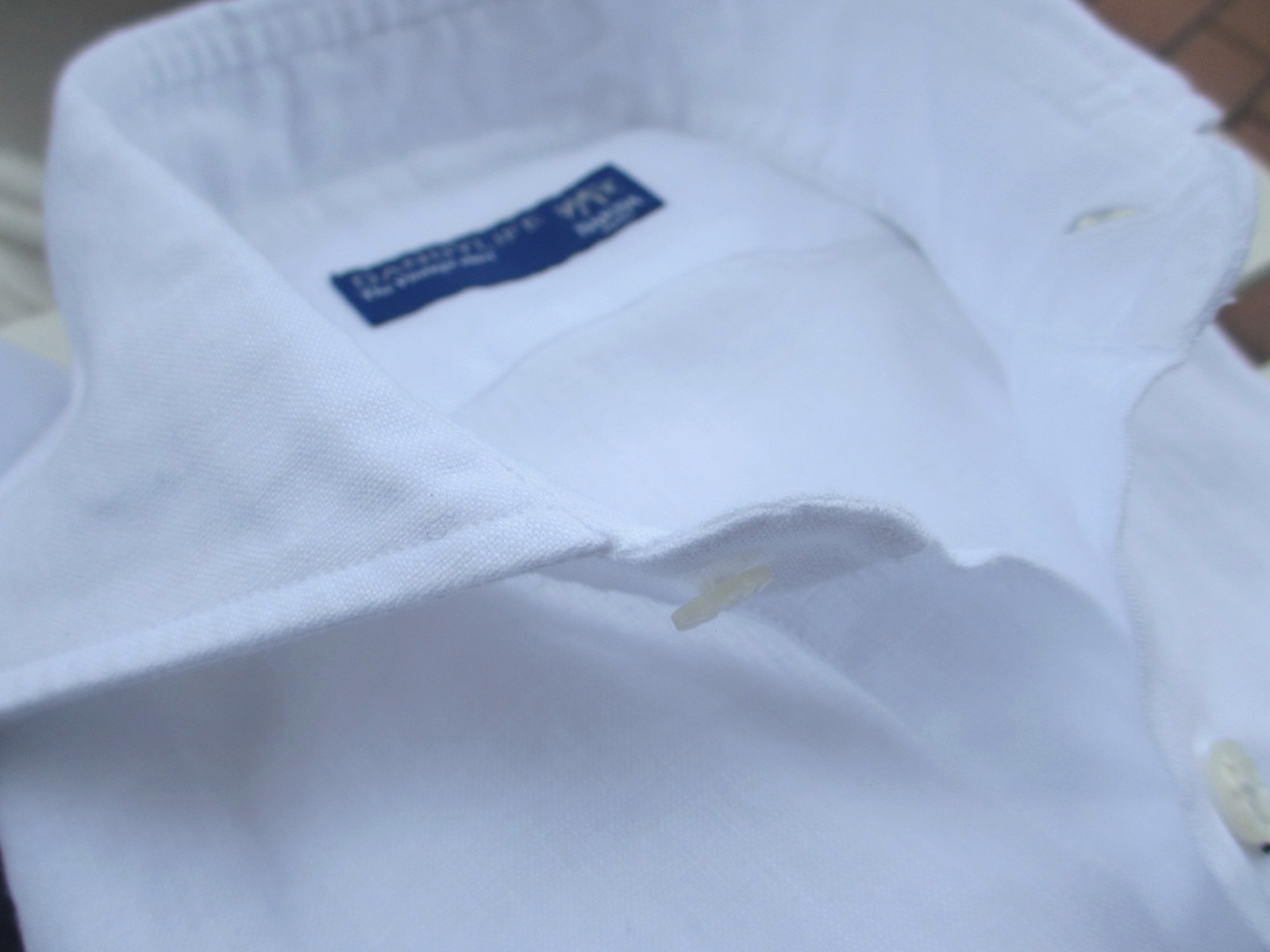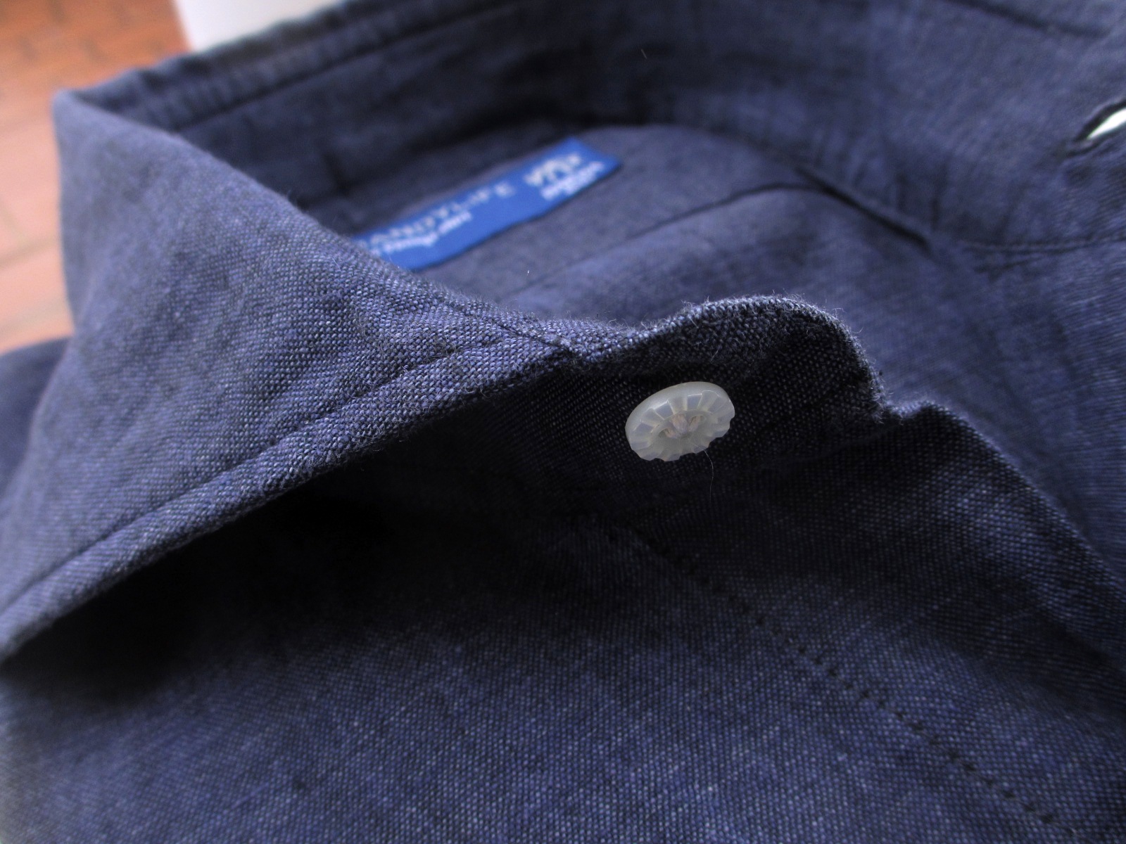 他のナポリシャツにはない、バルバ特有の逆三角形フォルム。通常、リネン素材の場合、他の素材と比べると少し緩めな設定になりますが、今回のモデルに関しては、通常のサイズ感です。