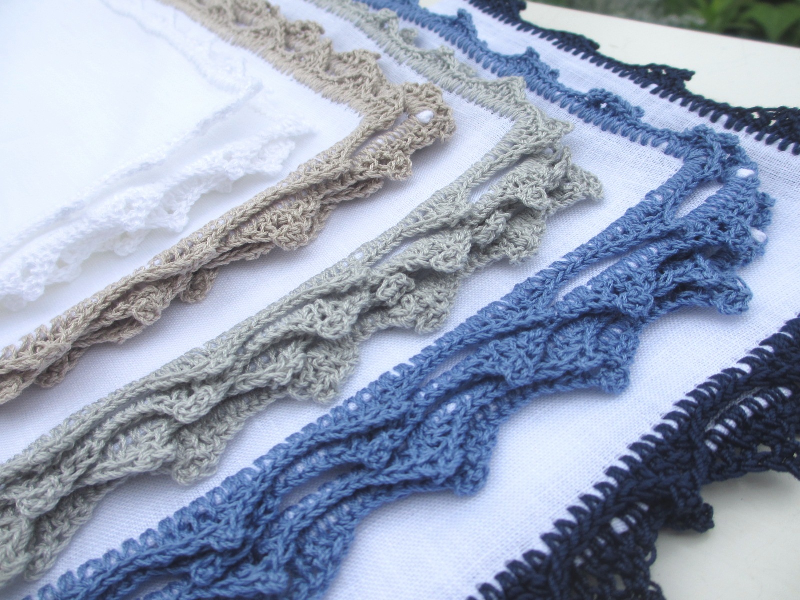 今回、入荷したのは全てホワイトベース。縁取りの色がホワイト、ベージュ、グレイ、サックス、そしてネイビーの5色です。