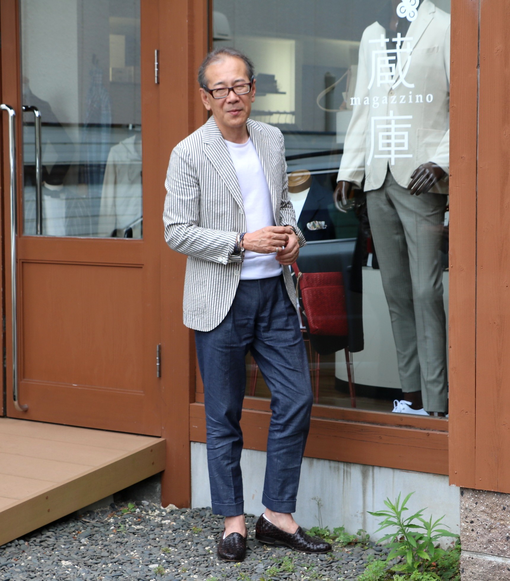 着替えたのは、蔵庫/マガジーノで展開中のL.B.M1911(エルビーエム)のコットンストレッチスーツ。生地感、色目ともに申し分なく、今、とても気になる存在です。コットンスーツのインにカットソーやニットを合わせるのは、ここ最近、よく見かけるスタイル。ただ、無地同士の組み合わせは、ともすれば単調になりがち。そこで、チーフの出番。さり気なく挿せば、全体に華やかな雰囲気になります。もっと華やかにと望むならば、