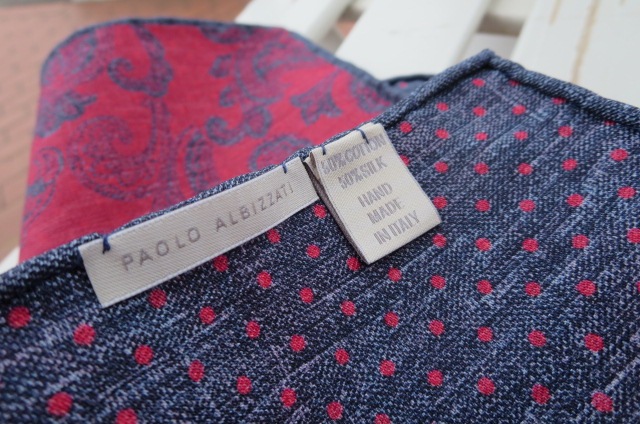 降るべき時に降って欲しい雨。梅雨入りしたというのに、雨は降らずです。ということで、本日の出で立ちは、雨乞いの装い...いや、単にシアサッカーのストライプ柄ジャケットを雨に結び付けただけです。爽やかなホワイトのニット(JOHN SMEDLEY)にシャンブレーブルーのパンツ(PT01)で瑞々しさを。♪降りそうで降らない黄昏時は...♪は、シアサッカー。確か南沙織さんの歌。いやいや、違います。♪暮れそうで暮れない黄昏どきは♪でした。「人恋しくて」のタイトルどおり、淋しさを感じるフレーズですが、私の出で立ちもどことなく淋しげ。ならば、挿してみよう!! が、本日のご提案です。1975年、イタリア・バレーゼで創業の【PAOLO ALBIZZATI/パオロ アルビザッティ】。4月10日のネッカチーフに次いで2回目の登場です。
