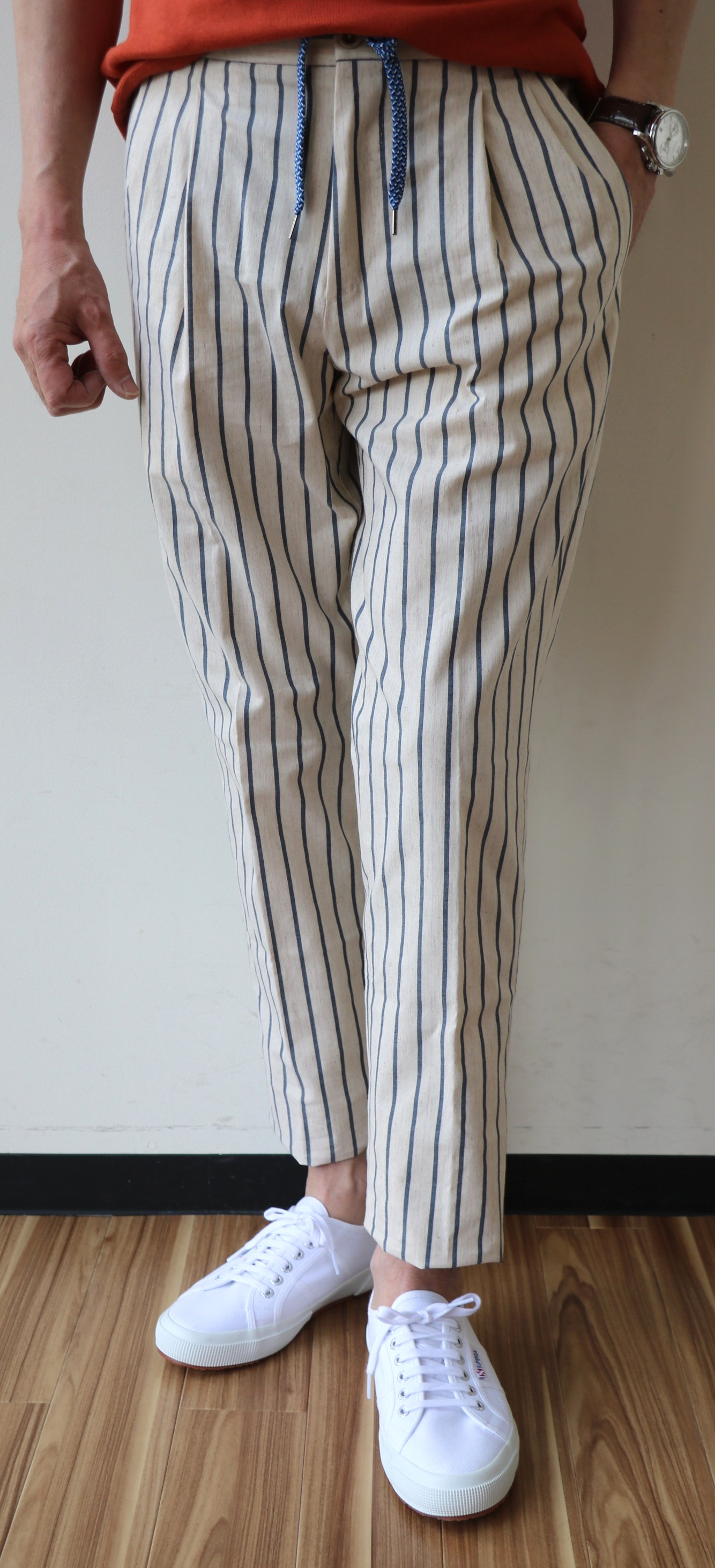 クォリティの高いパンツファクトリーだからこそ、セレクトできる生成りベースのストライプ柄パンツ。安易なブランドでは表現できないエレガントなリラックスパンツです。昨日、掲載させていただいたBAGUTTA(バグッタ)の「BRAD」、インにマガジーノで展開中のMAISON CORNICHON(メゾンコルニション)を合わせ、足元はSUPERGA(スペルガ)のクラシックスニーカーを履いてみました。