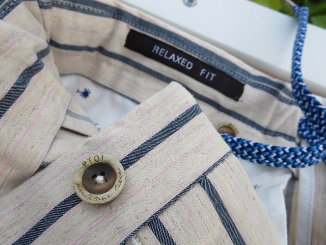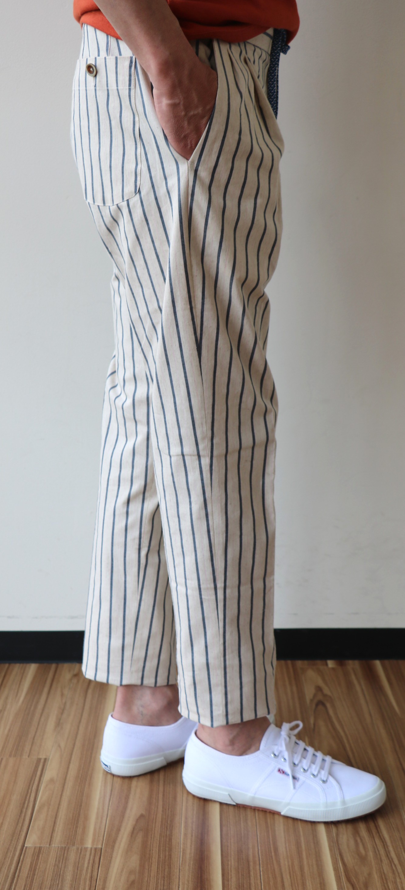 イメージ通りの「RELAXED FIT」。コットンにほんの少しリネンを混ぜたストレッチパンツです。杢調の生成りベースに抑えた色合いのネイビーと薄いピンクのラインが入ります。