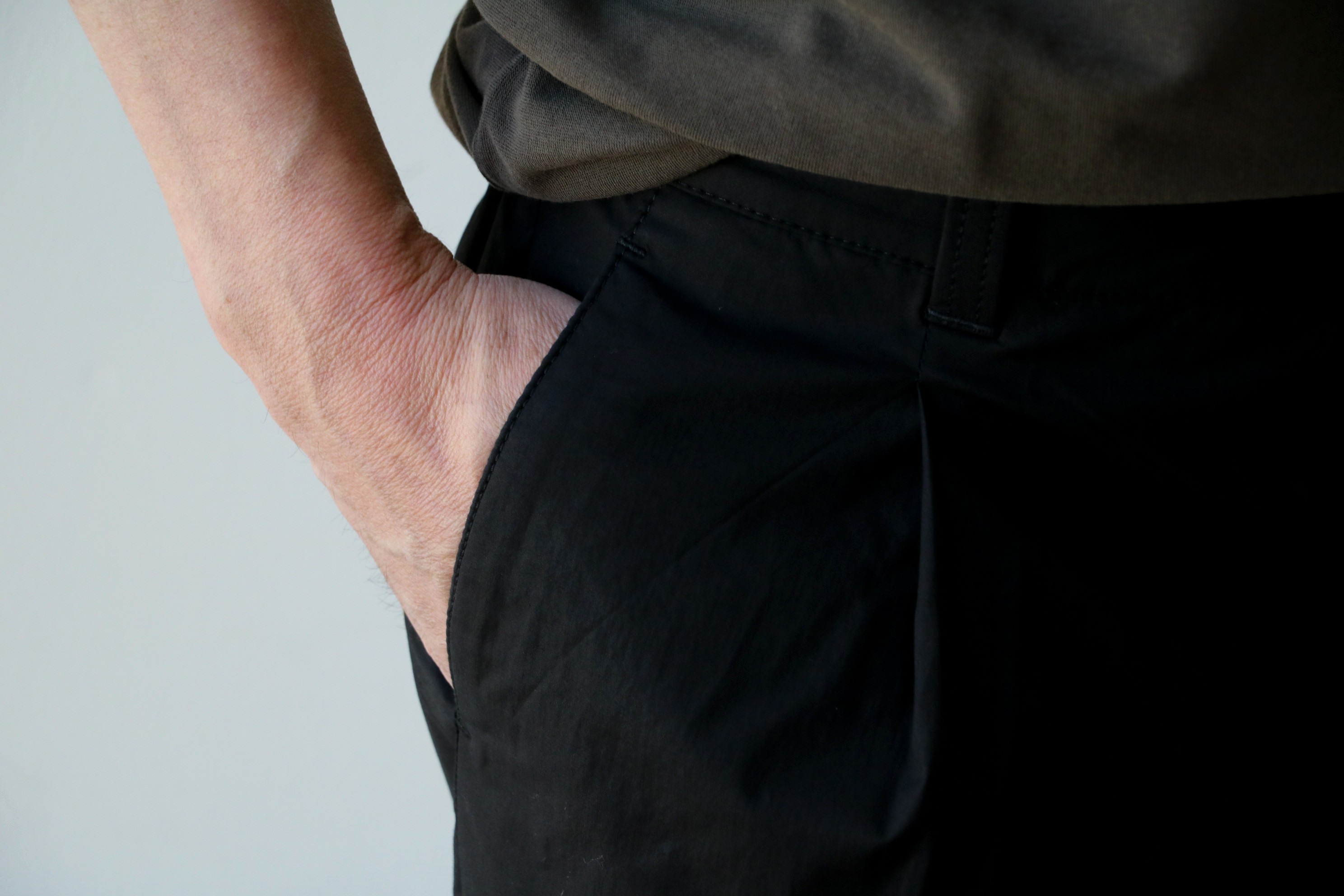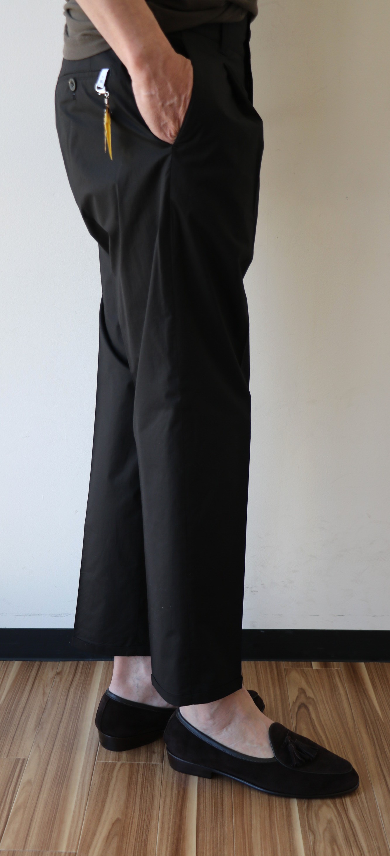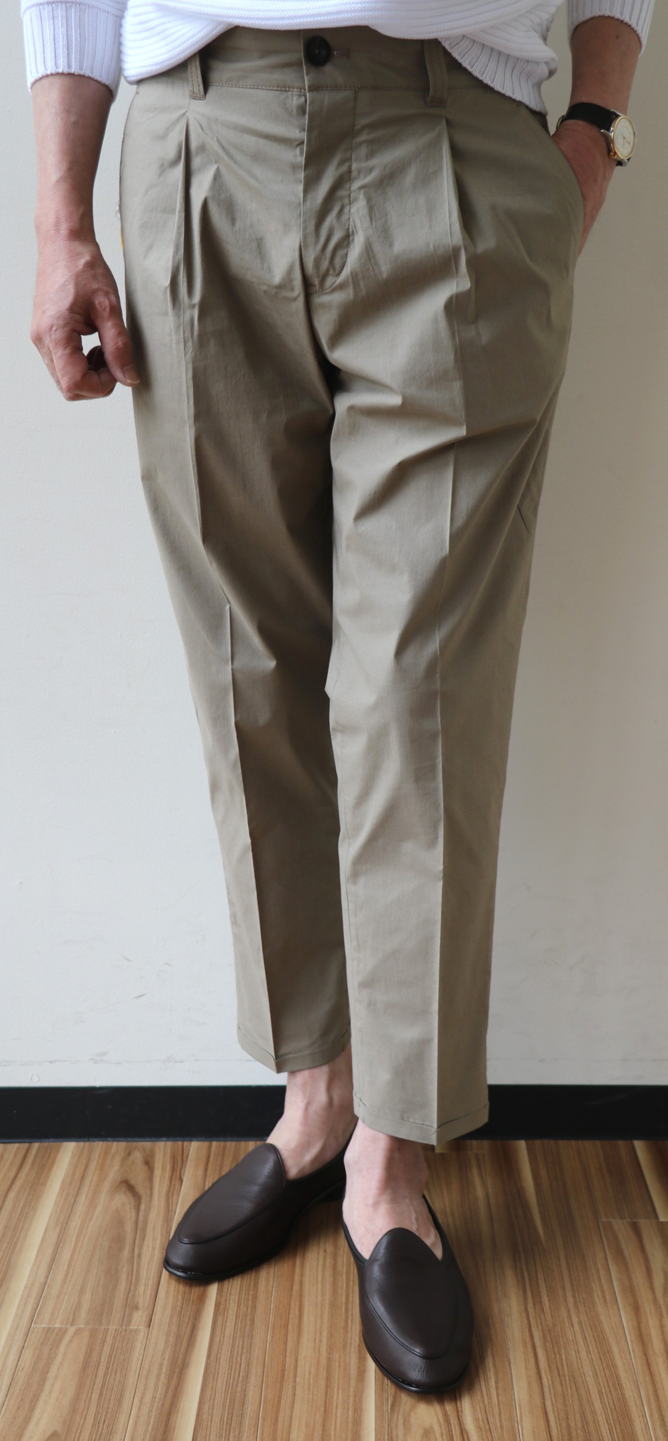 モデルは「style:05」。以前、冬に展開し、私を虜にした「style:04」にタックの付いたワイドフィットのクロップドモデルです。敢えて、このタイプのライバルを挙げるなら、INCOTEX(インコテックス)のROYAL BATAVIA ストレッチコットンパンツ、あるいはTHE GIGI(ザ ジジ)のライトチノとシアサッカーパンツでしょうか。いずれにしても、コットンのベージュorオリーブとブラックは押さえて置きたいパンツです。
