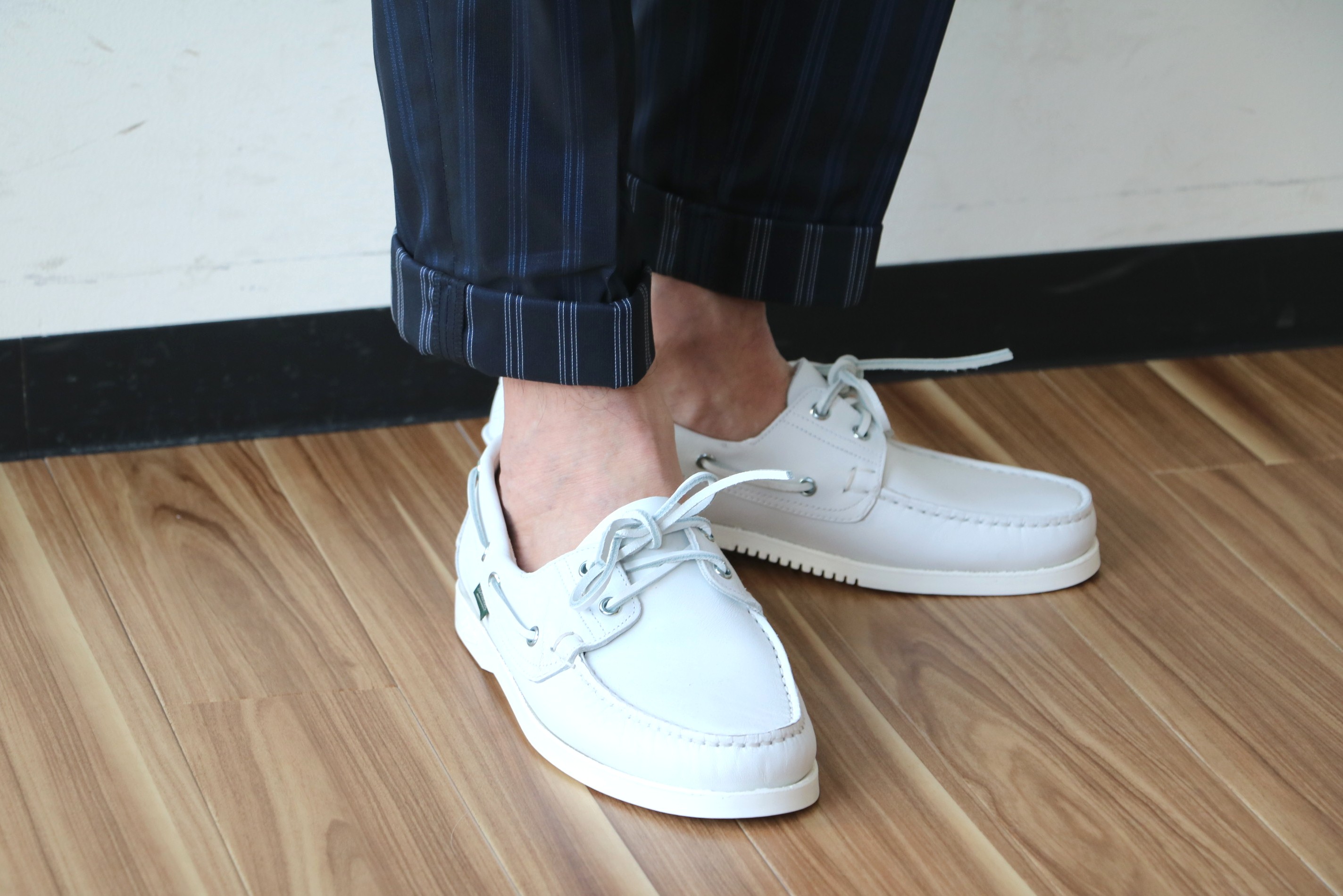 都会の楽園で穿きたいパンツです。大人の方々が集うレストランやラウンジで、常連さんから「着方、参考にしていますよ」なんて声がかかると、ついつい頑張ってしまう単純さ。服選びの思考が、どうしても夜の方にいってしまうだけに、このパンツは目的を果たせそうです。ただ、あくまでも知的に爽やかに。スケベ心は、胸の内にあっても表に出してはいけません。そこで、清涼感のあるALFREDO(アルフレッド)のニットを合わせ、足元はParaboot(パラブーツ)の「BARTH/バース」で、ヨット帰りを装います。