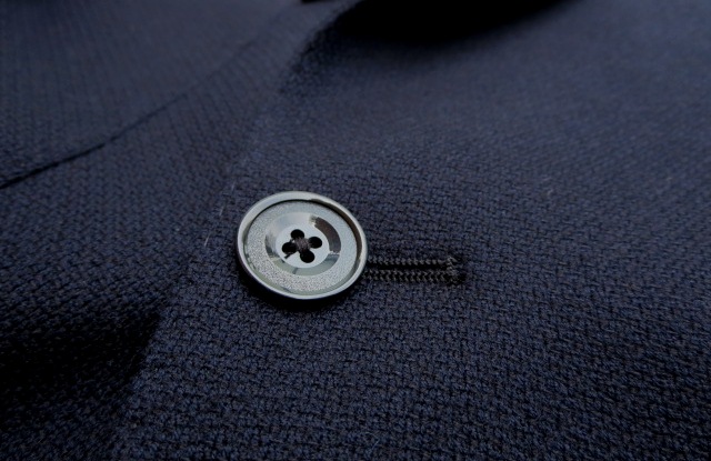 ネイビーのホップサック織りダブルブレスト。今までのインパクトのある表情とは一味も二味も異なるシックなジャケットに仕上がっています。敢えて、釦もシンプルにセレクトです。
