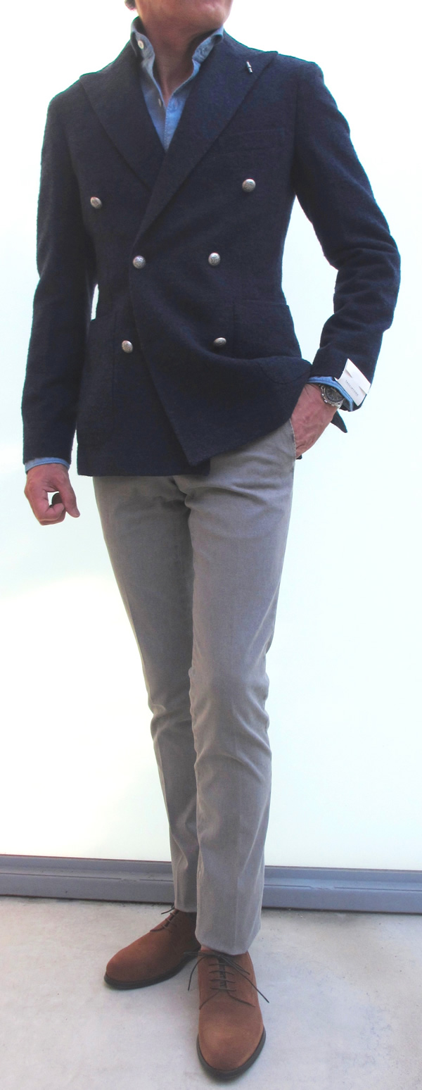 モデルは身長175㎝、体重63㎏、胸囲91㎝でサイズ44をタイトに着ております。ブラウンで合わせたシャツはBARBAの「DANDY LIFE」、パンツはPT01の「WEST POINT ウール」、ネイビーで合わせたシャツはフィナモレの「SERGIO」、パンツはPT01の「WEST POINT コットン」、靴はどちらもDOUCAL'Sです。