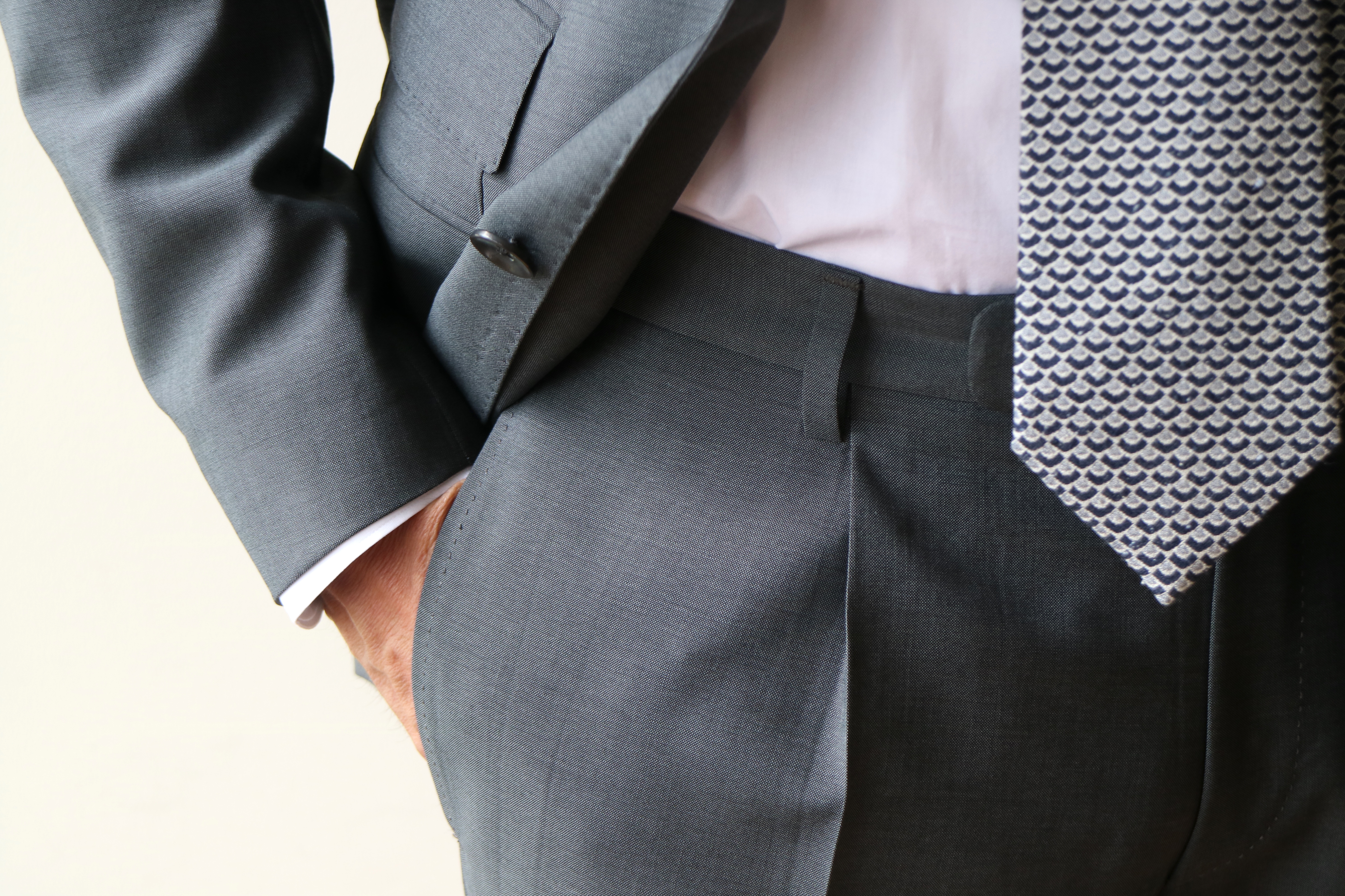 【TAGLIATORE/タリアトーレ】は、スタイリッシュです。同じ46を着ておりますが、高めのウエスト位置や着丈の短さ、そして細身のパンツラインが、より体に近く、シャープなシルエットを生み出します。街で略礼服として、安価に売られているブラックスーツとは雲泥の差です。