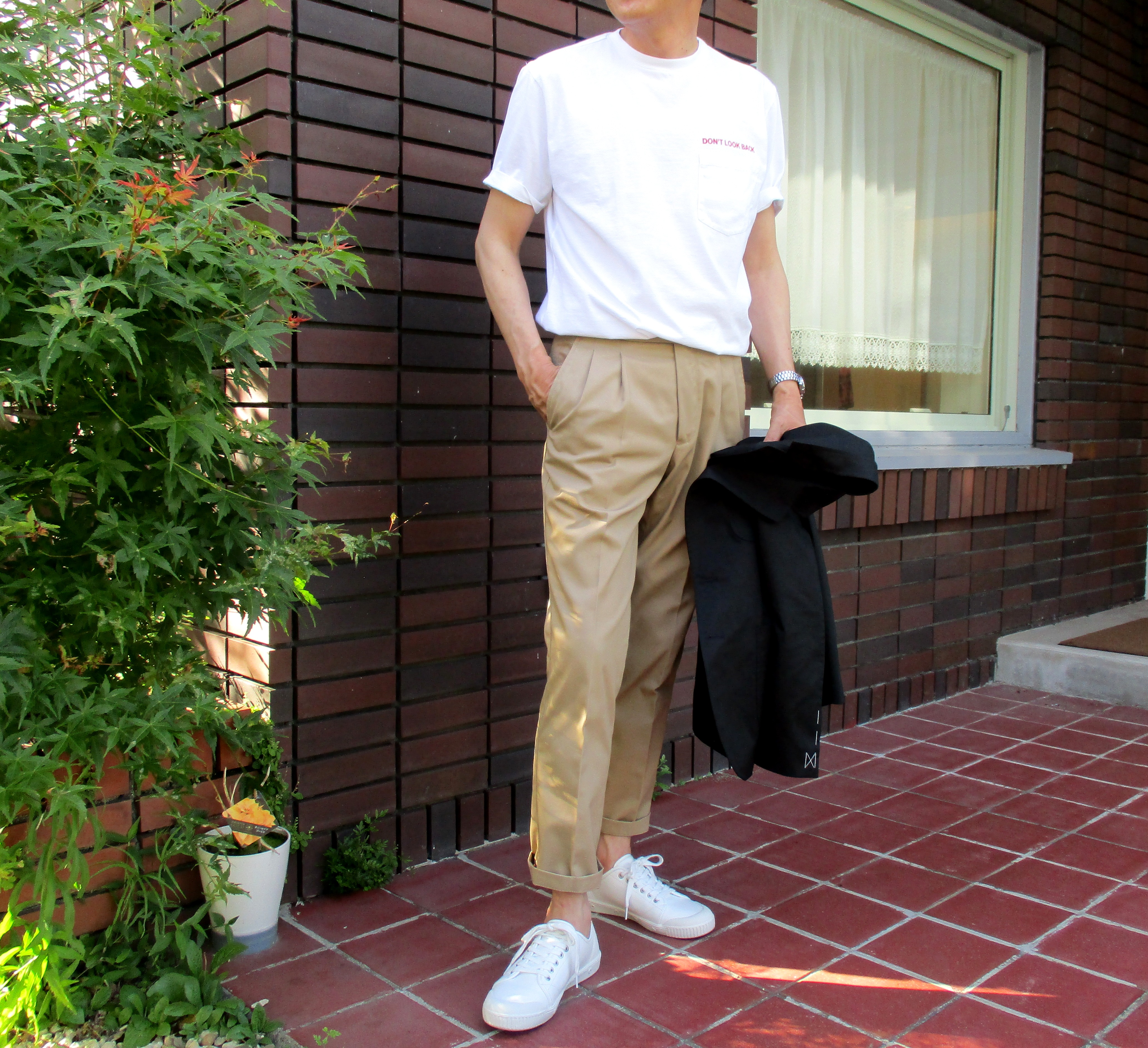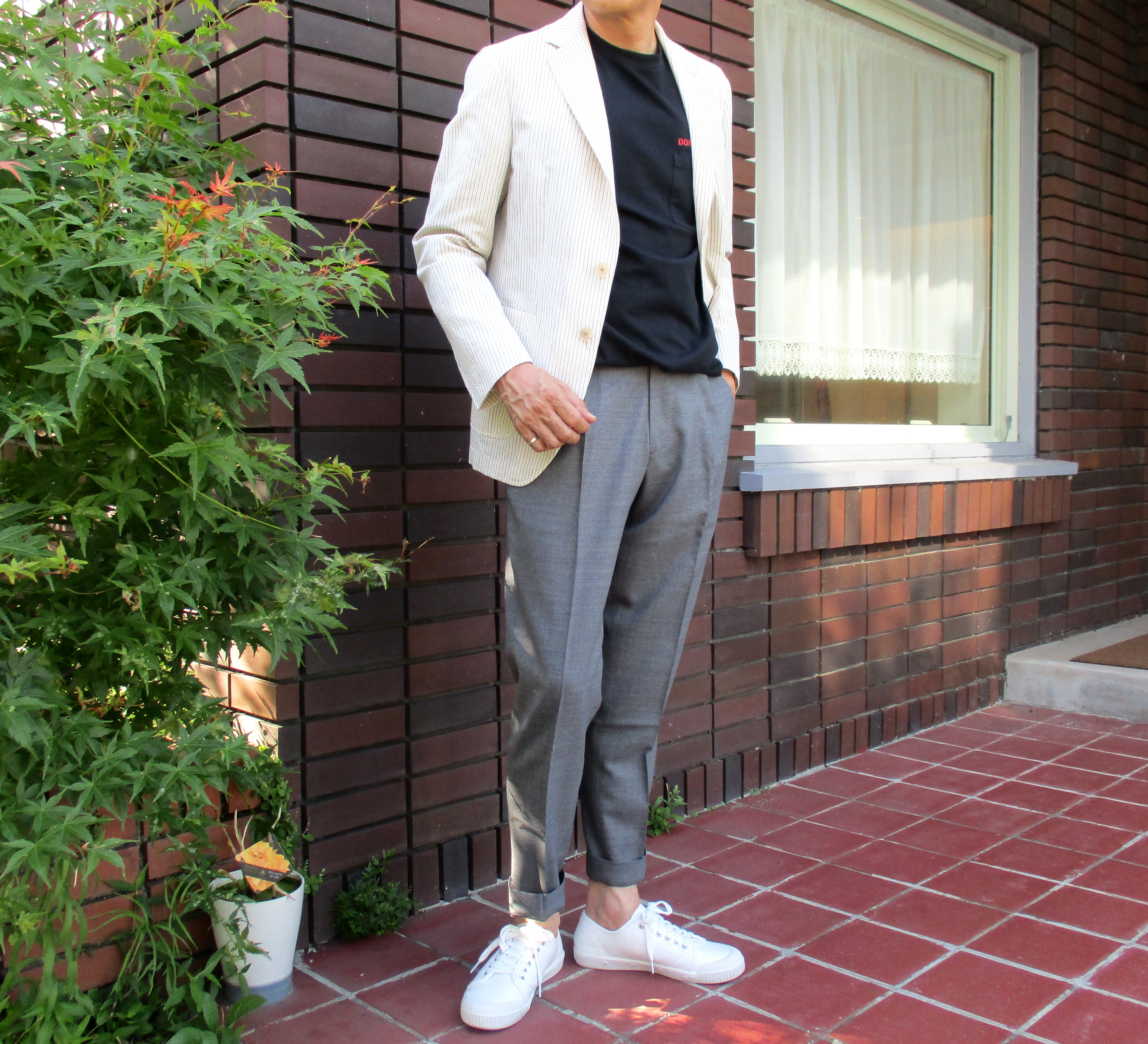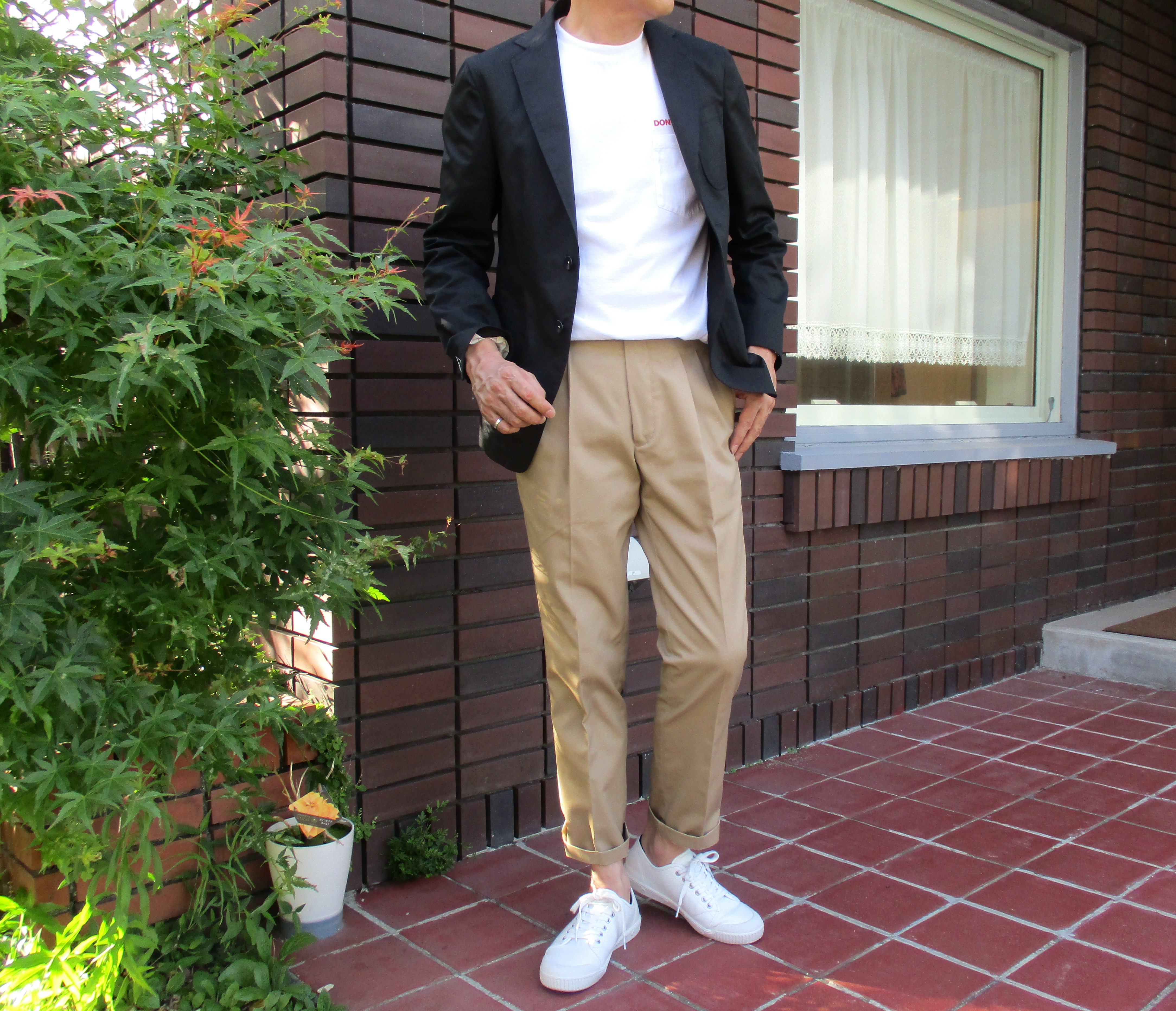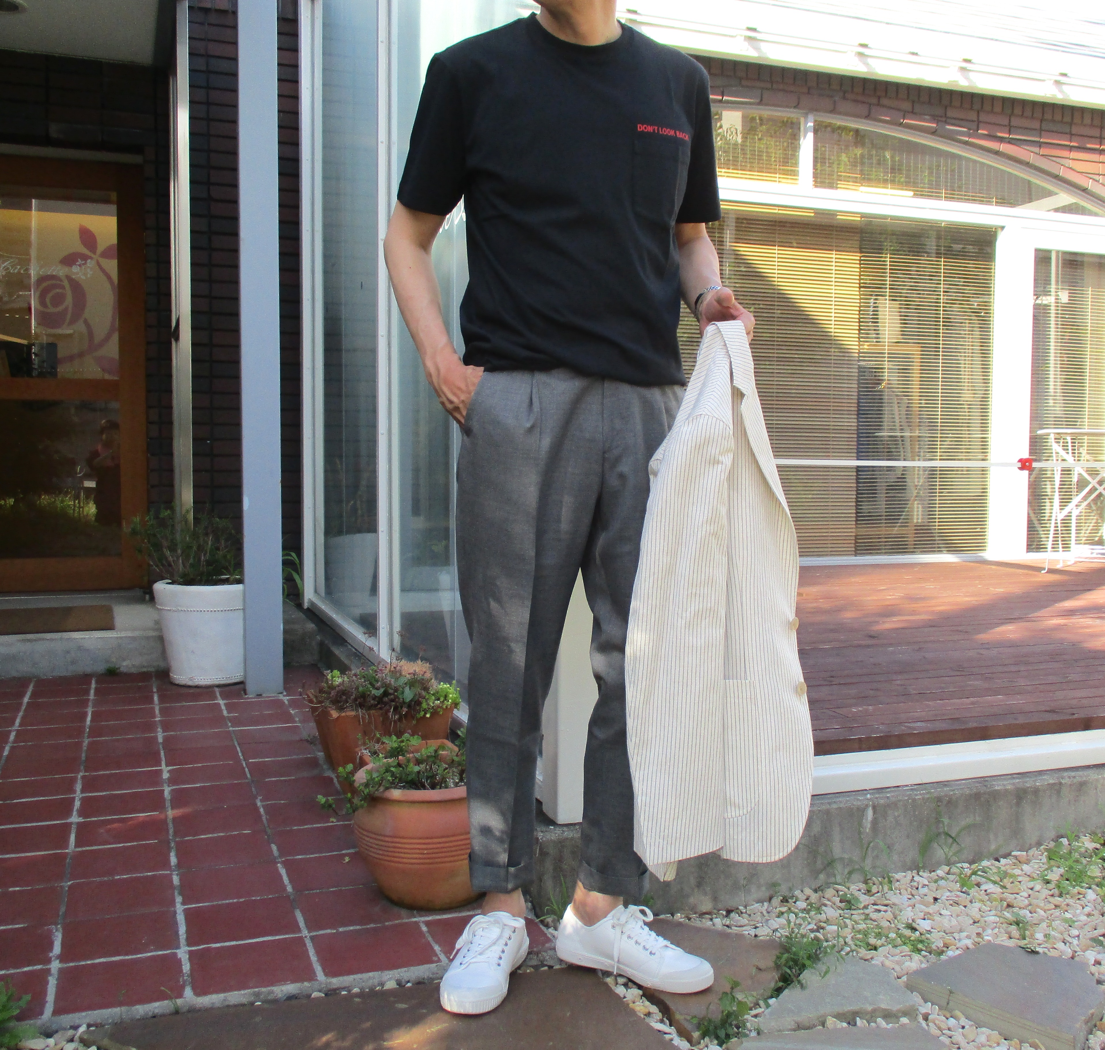私物のスニーカー以外、ジャケット、パンツはTHE GIGI(ザ・ジジ)で合わせてみました。