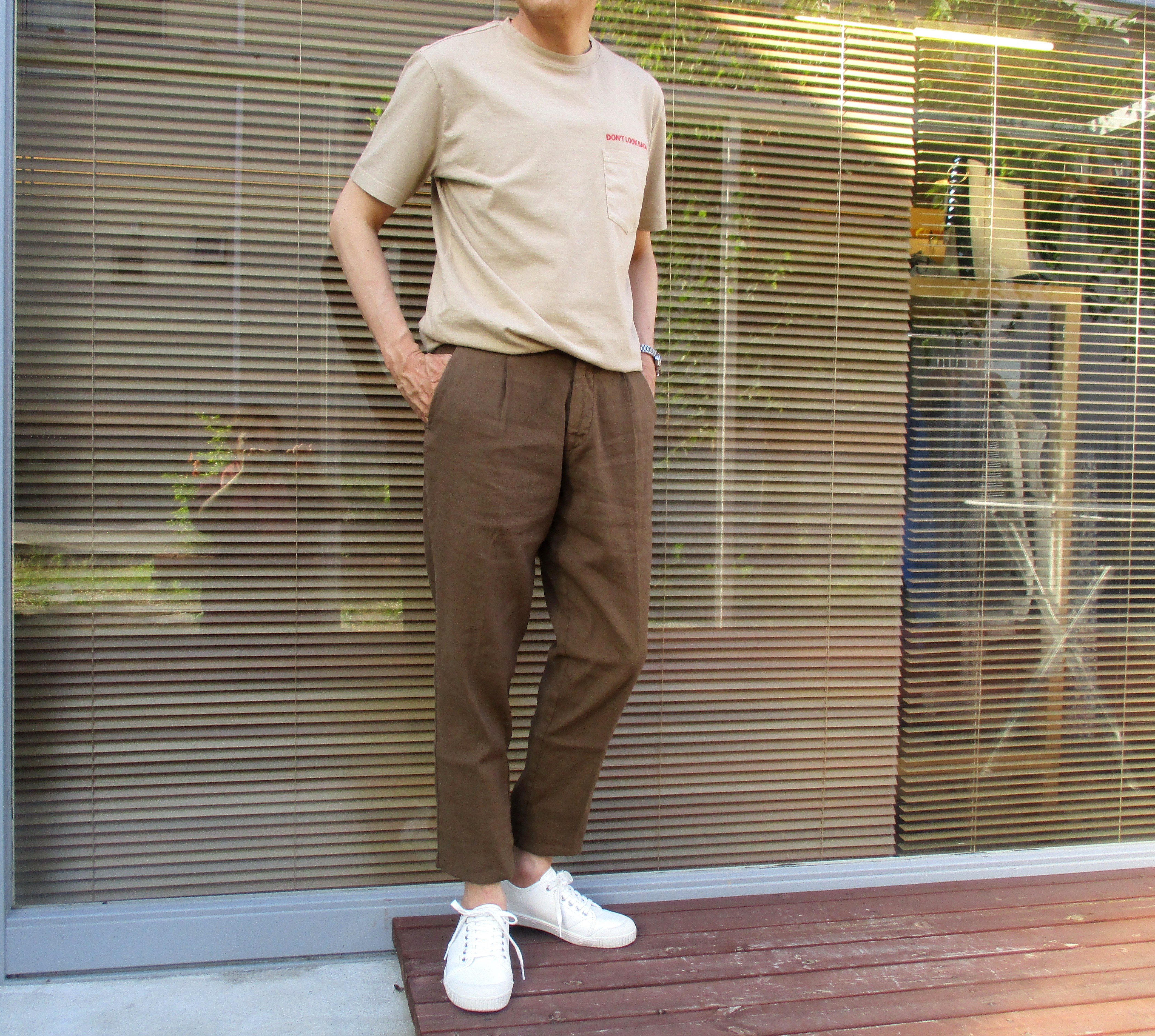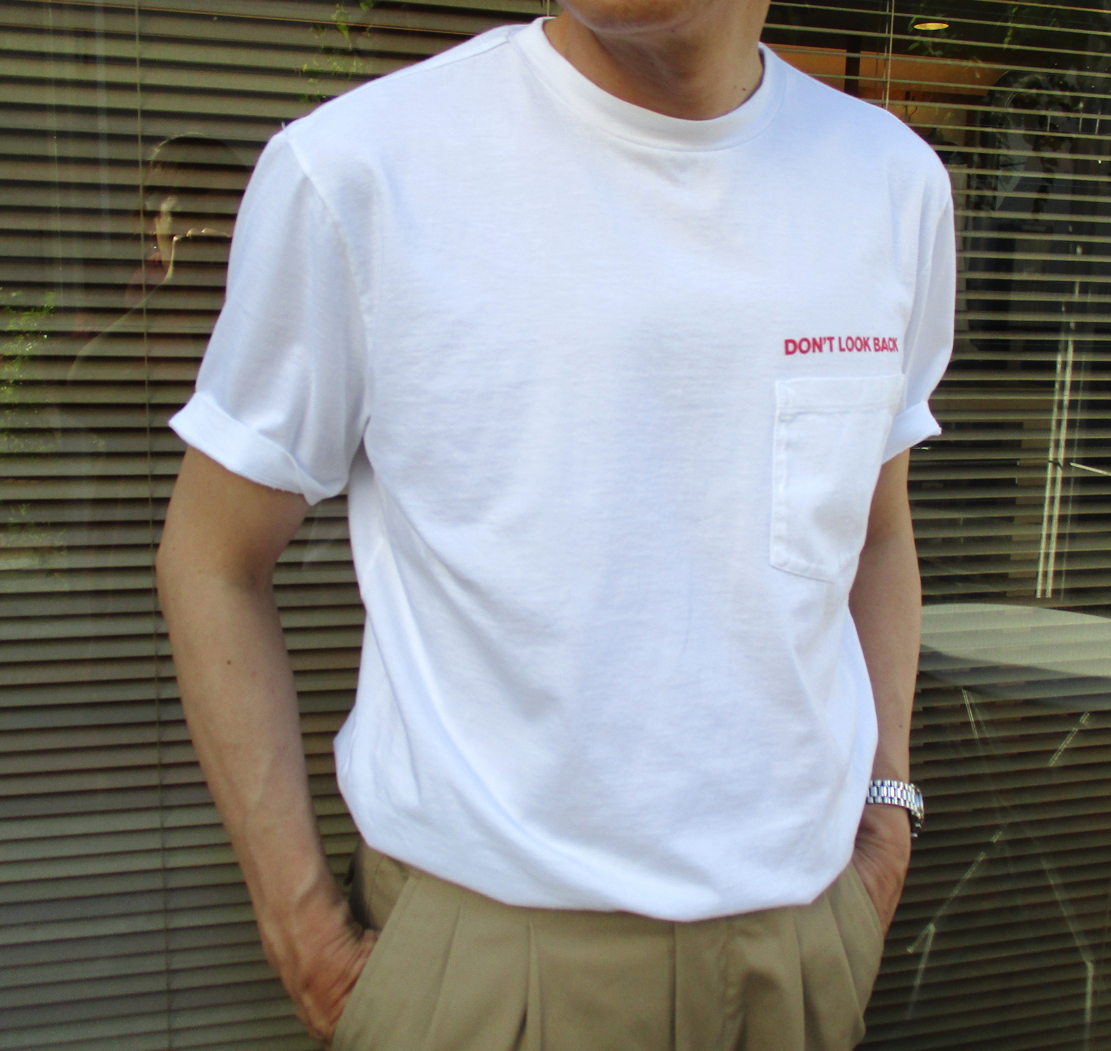 フラメンバーのユニフォームにしようかと秘かに企んでいた"DON'T LOOK BACK"のロゴ入りポケット付Tシャツ。ちょうどメンバーは。過去を振り返ってばかりの50過ぎのジジィだけに、このメッセージ入りのTシャツは、ピッタリなんです。誰が何色を着るかもほぼ決まり、後はサイズ選び。Iちゃんは、サイズ44を着るので、XS。50サイズのT君は、M。問題は、44から46へ移行した私なんです。上の写真は、サイズXSを着用。商品をご案内させていただいたのが、2月24日ですが、あれから日が経つにつれて、トレンドに敏感な私は、先取りしてしまった緩んだお腹周りに合わせて、やや大きめで着たい気分に。ならば、もう一度、検証してみようということが、本日のご提案に繋がっているのです。