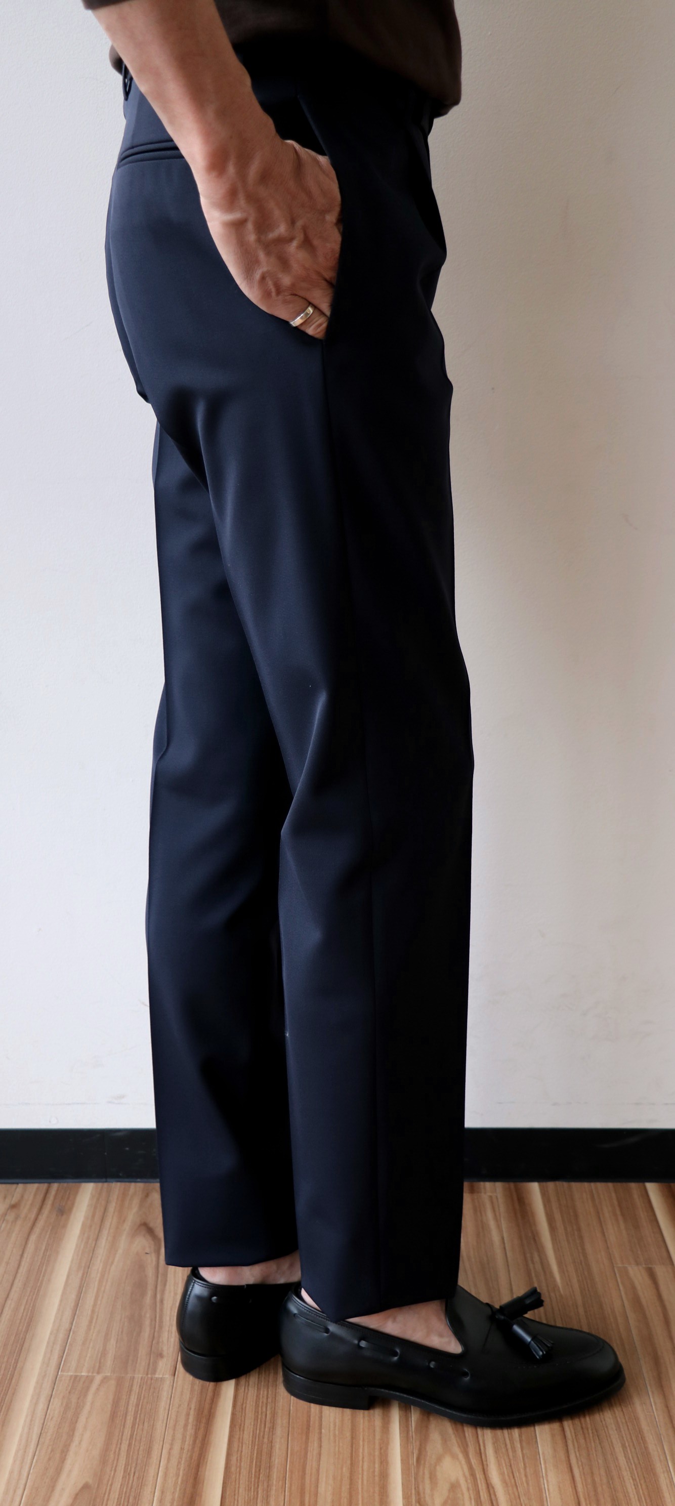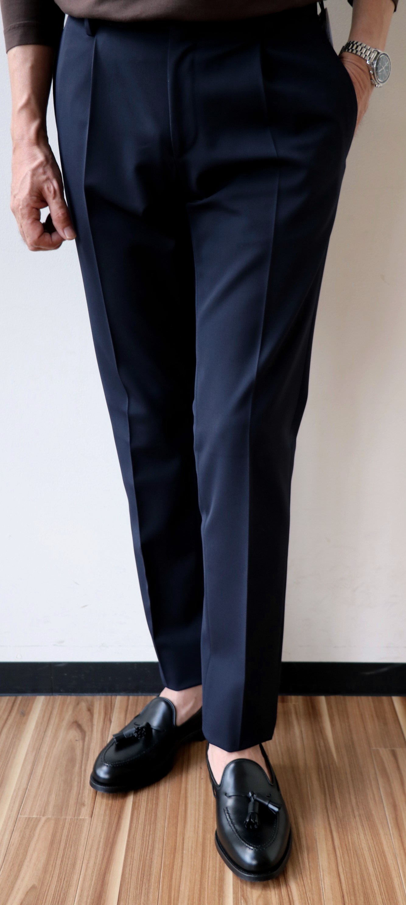 共地のパンツは、アウトのワンプリーツです。タック入りの中では、この形が最もスポーティーです。